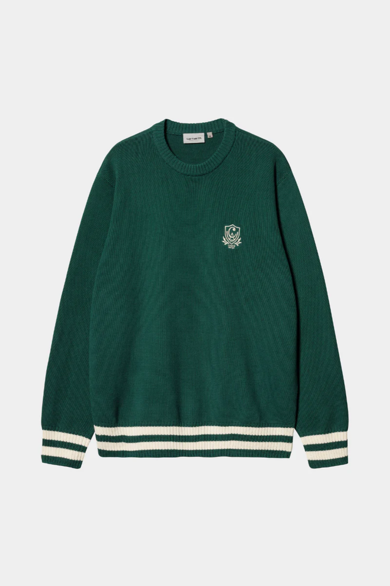 The Cambridge Sweater is a midweight cotton knit. It features contrasting rib-knit trims along the bottom band and cuffs. The item is further detailed with graphic embroidery on the chest. A flag label completes the design.