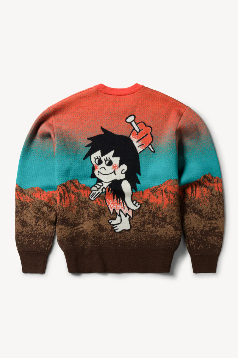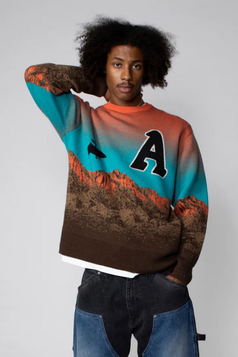 The Cave-They returns. Crew neck jumper featuring cave-they verdant mountain jacquard design with classic Aries branding.