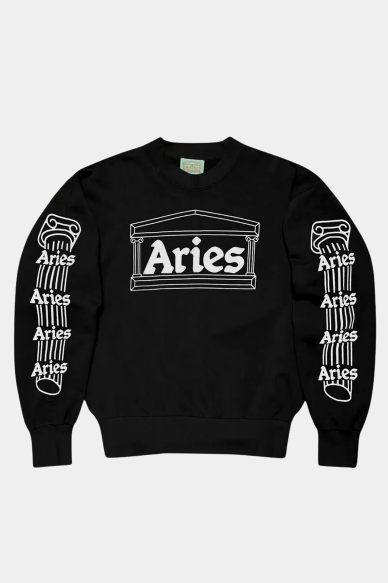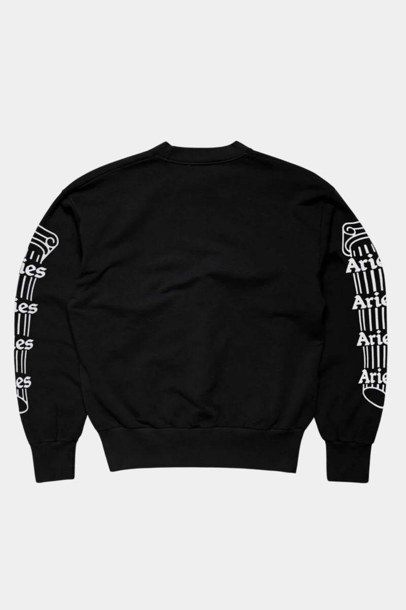 Unisex crew neck sweatshirt made from brushed-back jersey fleece. With a large Aries Temple screen-printed chest logo and Column screen-printed sleeve graphics. 100% cotton. Made in Portugal.