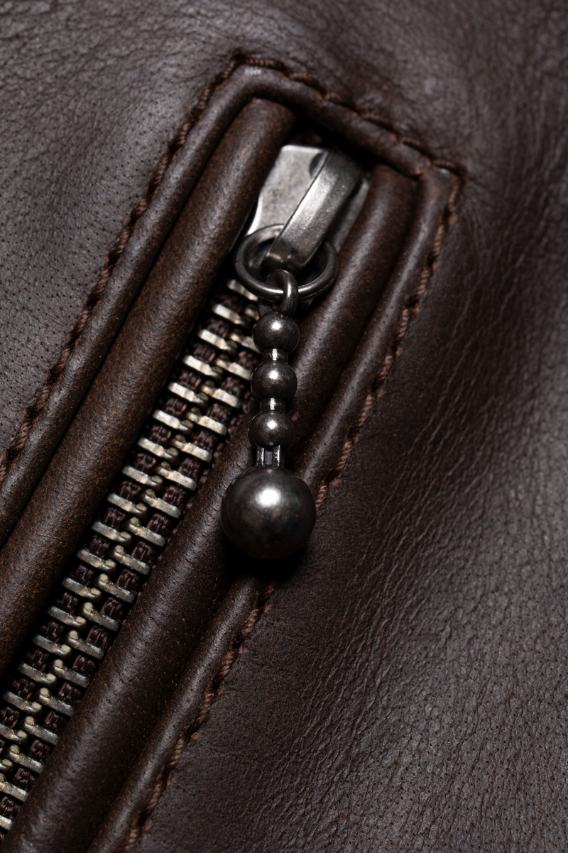 Jacket crafted in black, sturdy buffalo leather. It's made in a retro-inspired silhouette with a point collar and zipped side pockets. The body and sleeves are lined with recycled polyester. Inside, you also find two pockets to store small personal belongings. Zipped sleeves and buckled side tabs for a custom fit. When you buy this jacket, you can be sure we have paid our share of living wages.