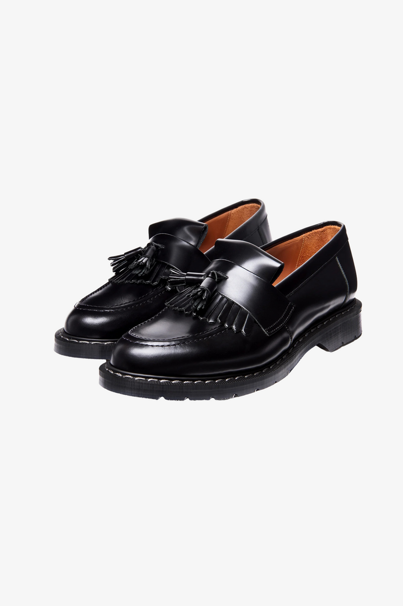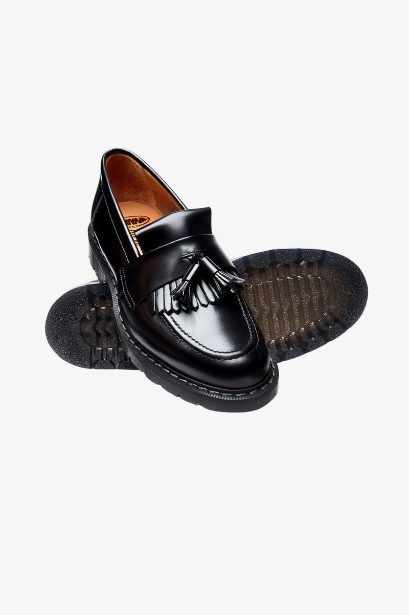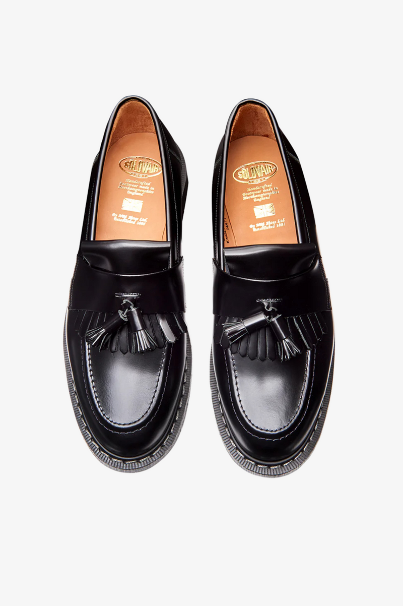 Solovair, founded in Northamptonshire, England in 1881, initially made boots for the British Army before shifting to fashionable, long-lasting footwear. Their unique Goodyear welt method ensures toughness involving stitching a welt and a pre-formed canvas strip onto the insole, showing the brand's commitment to quality craftsmanship. Featuring a leather upper and Soft Sole Suspension technology, the Hi-Shine Tassel Loafers offer both comfort and durability with its slip on style.
