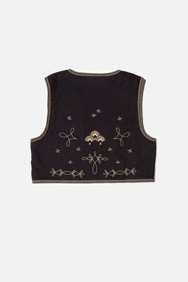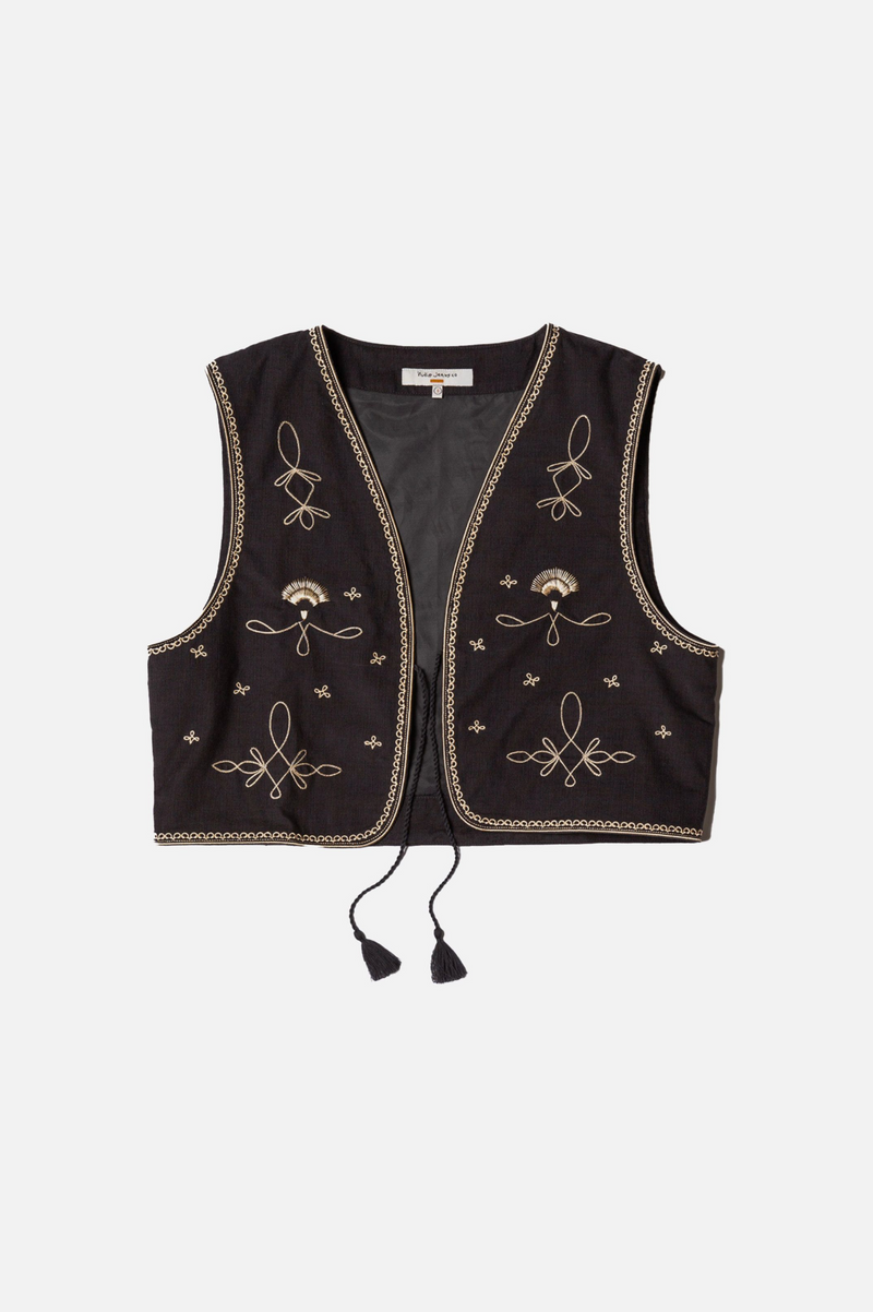 Rp 2.239.300,00 down 30% from Rp 3.199.000,00 *Approximately 149.14 USDVest made in organic and Fairtrade cotton needlecord. It's adorned all over with beautiful ornamental gold embroideries. The lining is a mix of recycled polyester and organic cotton. When you buy this vest, you can be sure we have paid our share of living wages.