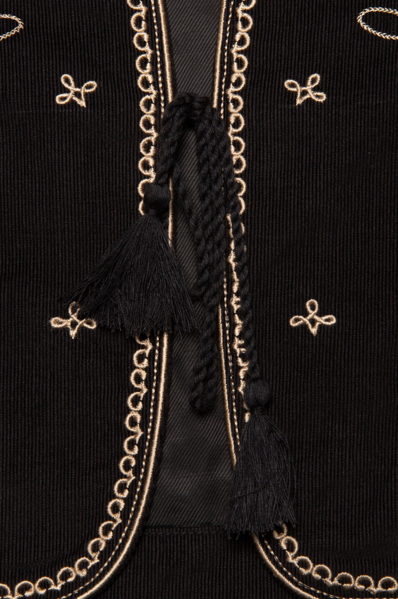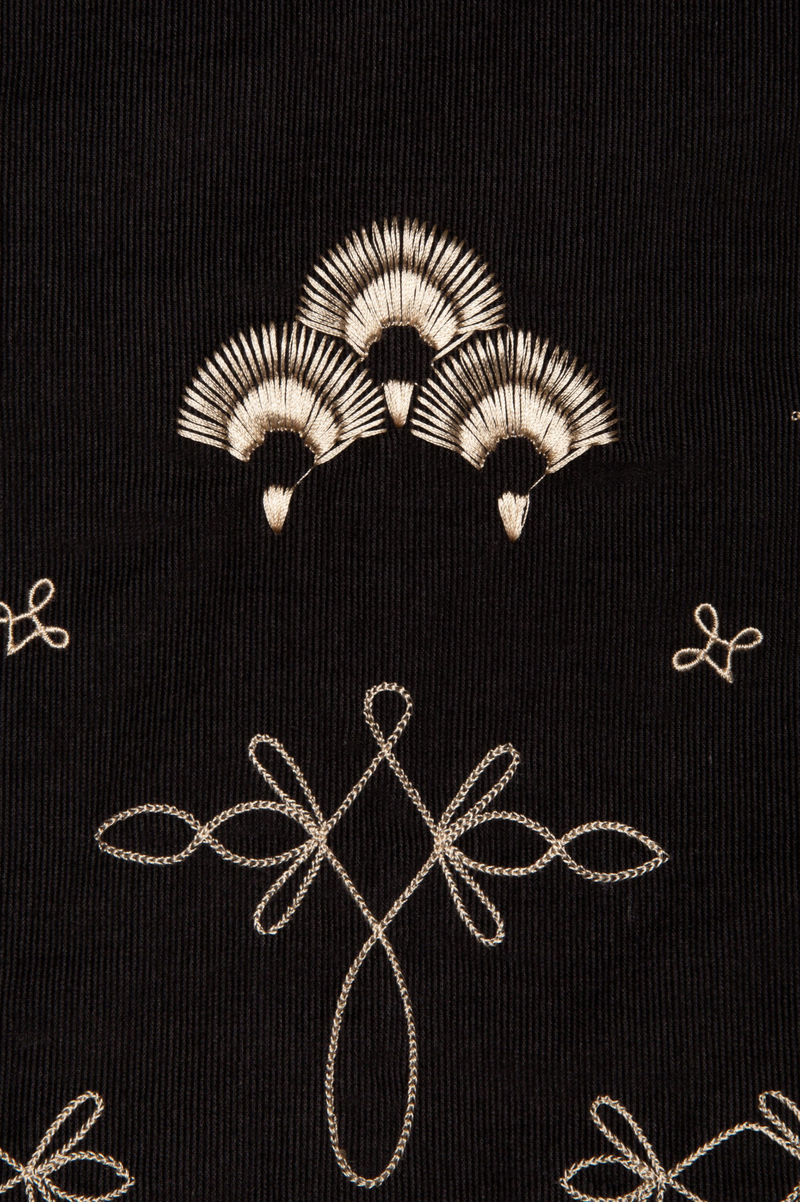Vest made in organic and Fairtrade cotton needlecord. It's adorned all over with beautiful ornamental gold embroideries. The lining is a mix of recycled polyester and organic cotton. When you buy this vest, you can be sure we have paid our share of living wages.