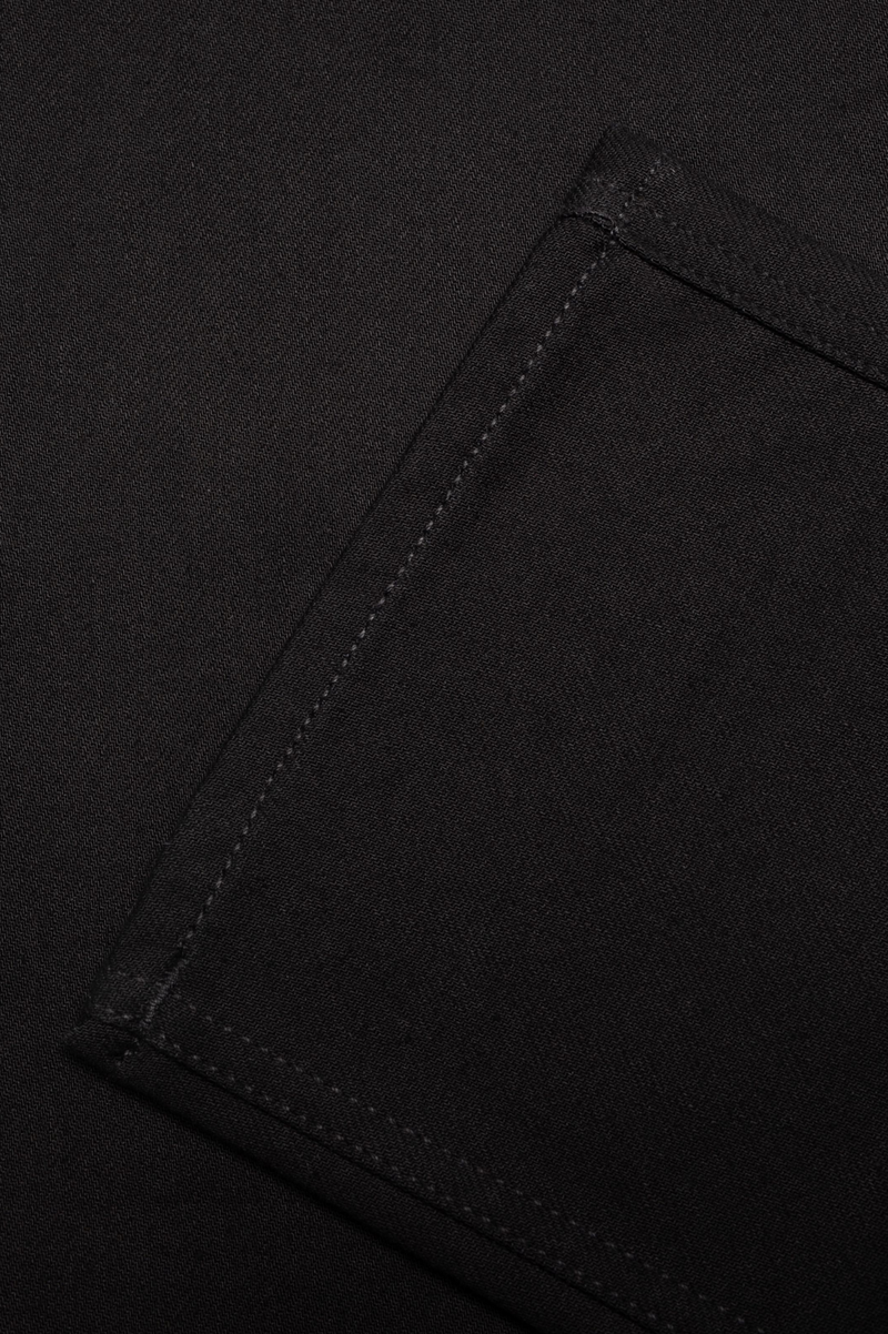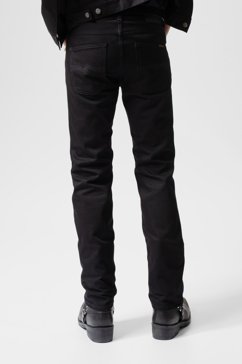 The Slim Jim, Nudie Jeans' classic slim-fit style with its signature twin-needle outer seam, is back. Crafted from pitch-black, black overdyed black denim, the Dry Black Tar offers a soft hand feel and a deep black hue that gradually fades into smooth, gray tones. The ring-spun denim showcases a uniform texture with a hint of vertical streakiness. Over time, this streakiness becomes more pronounced with wear, and subtle marble effects emerge through washing, creating a rich, evolving texture marked by muted black and gray tones.