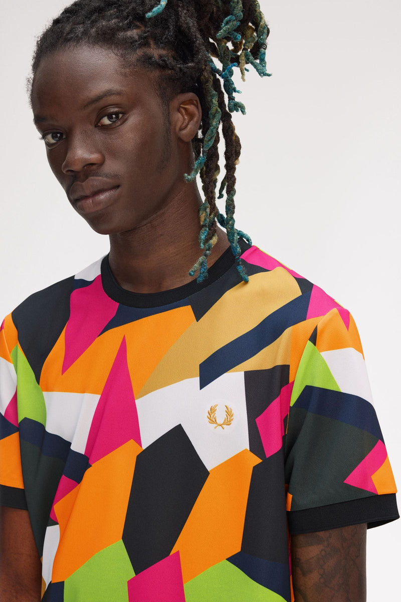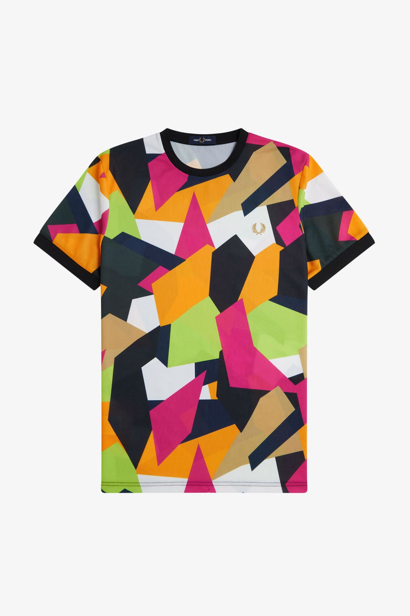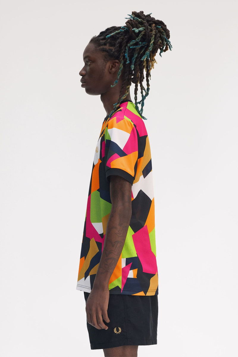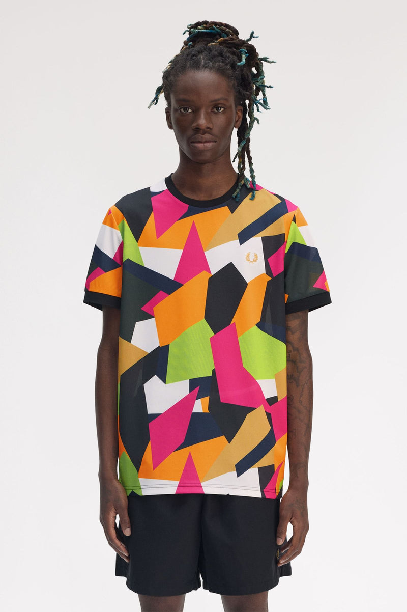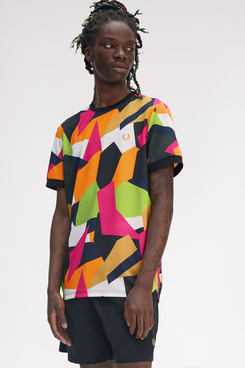 Recycled polyester fabric / Regular fit / Colour-blocked collar and cuffs / Abstract print / Embroidered Laurel Wreath to the left hand chest