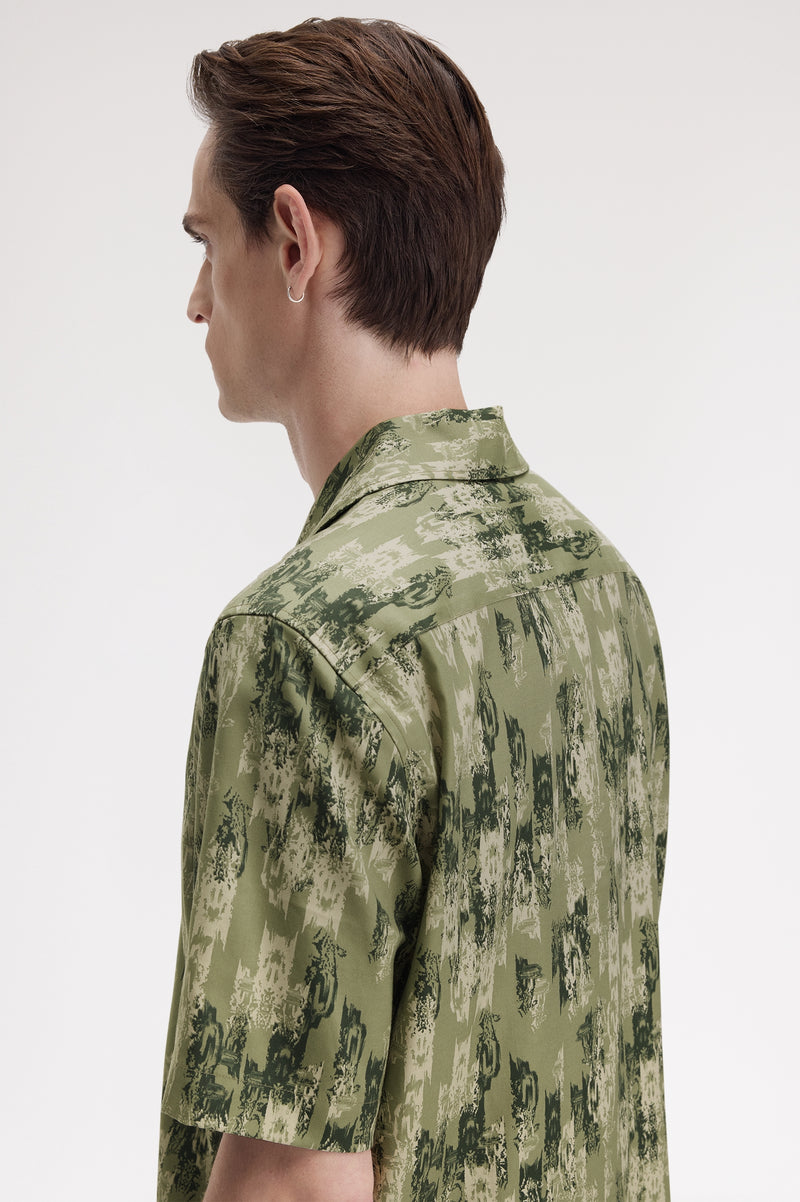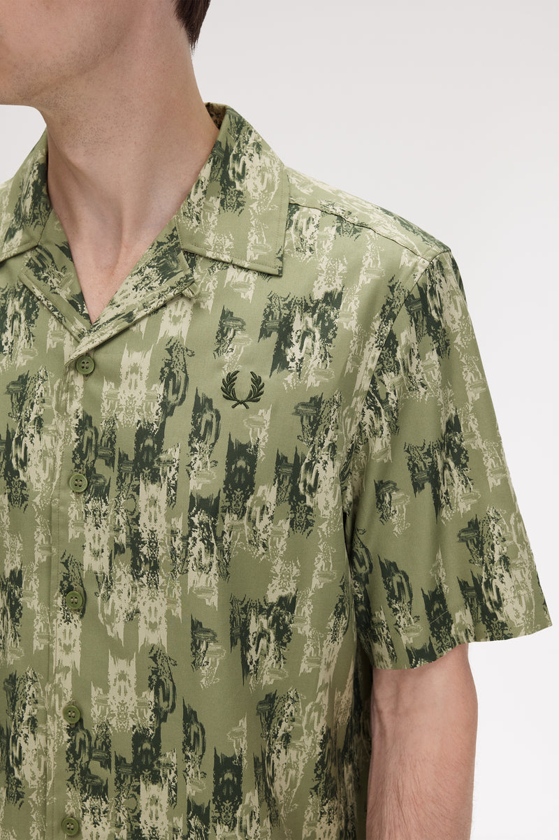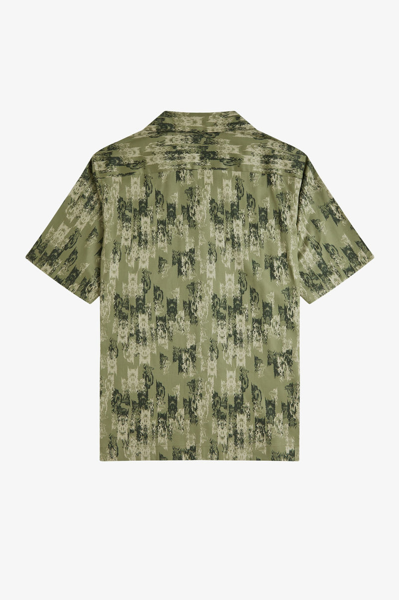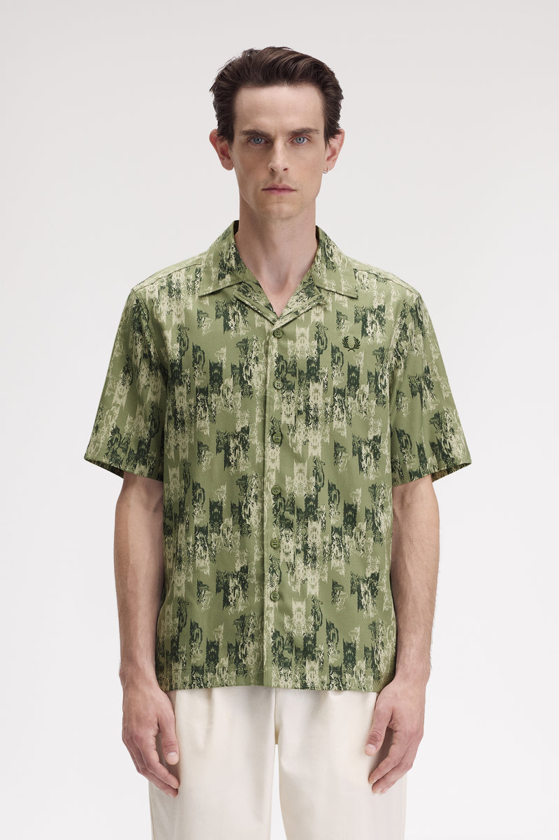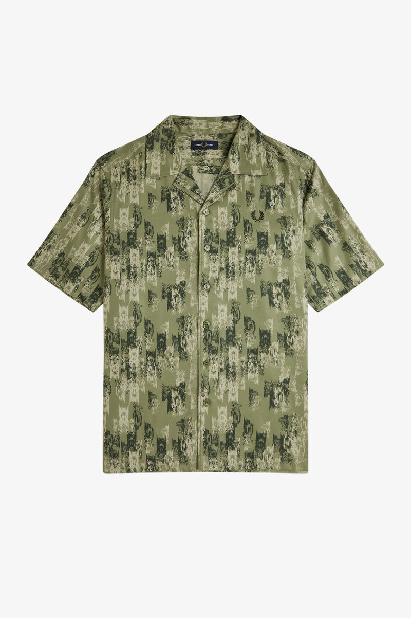 The bold and abstract design of this revere collar shirt references the muted colours of late ‘90s sportswear. Emboldened by the rebellion of European tennis players and their departure from an all-white Wimbledon uniform, runners and ravers alike made glitchy and repetitive prints mainstays of their subcultural wardrobes. Finished with a full button placket, and embroidered Laurel Wreath where you know to find it.