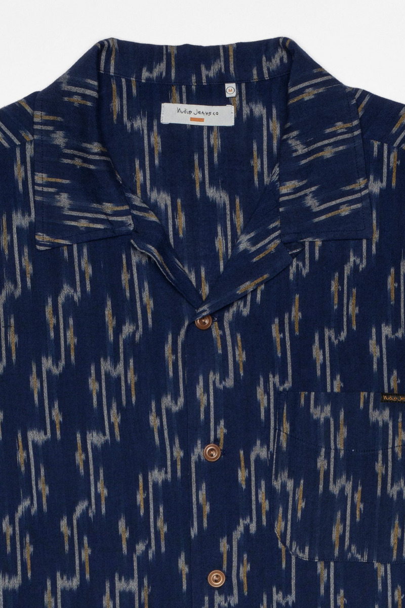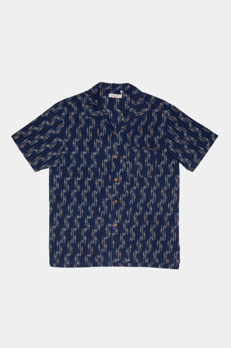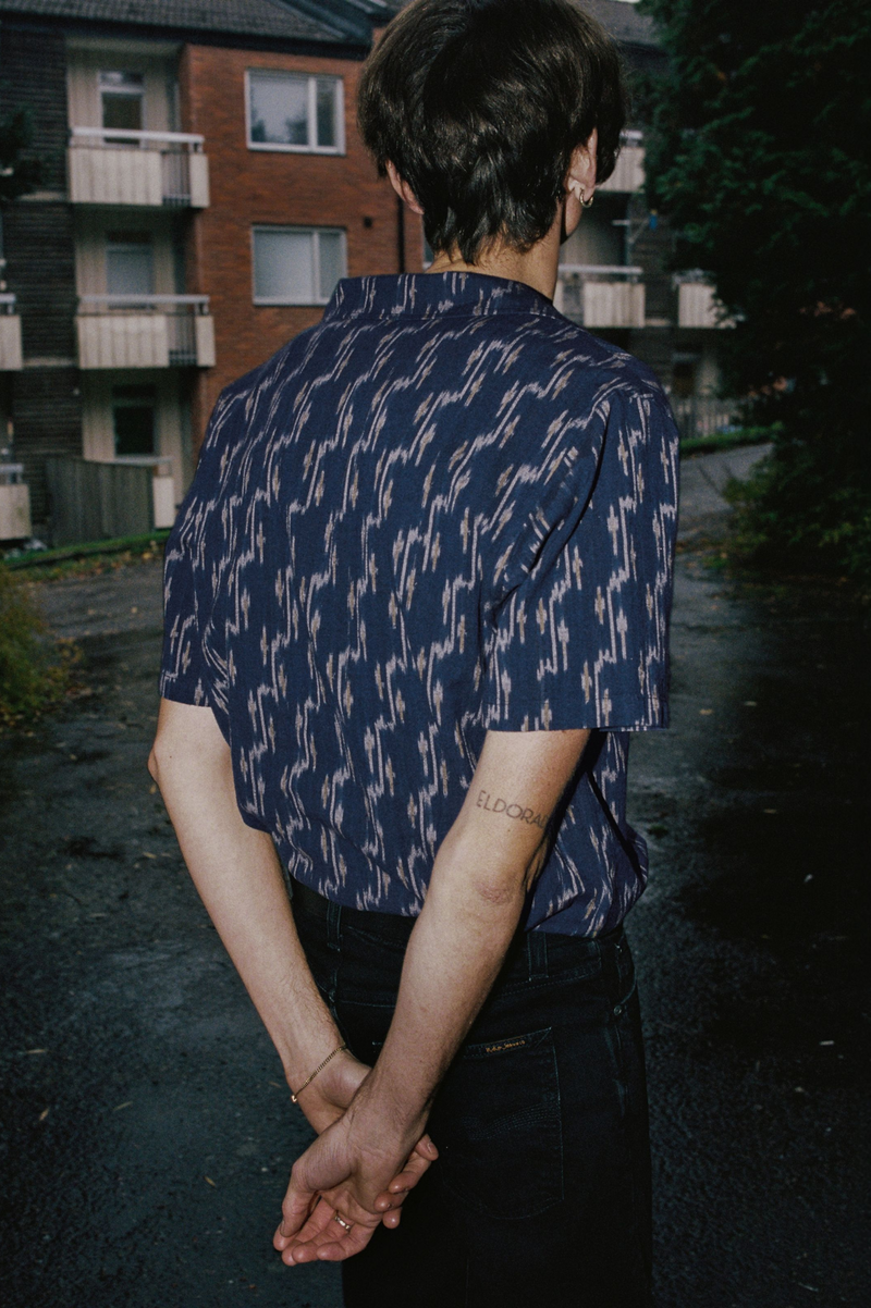 Short sleeve shirt crafted in a weave with a beautiful ikat pattern. The straight hem and the camp collar complete the relaxed, summery feeling. The light, soft fabric in this shirt is made with organic and Fairtrade regenerative cotton. When you buy this shirt, you can be sure we have paid our share of living wages.