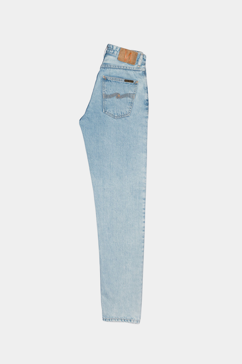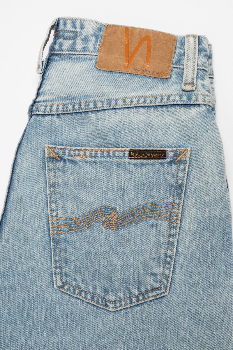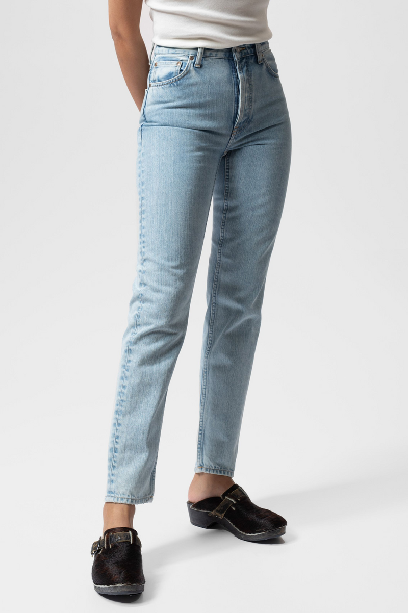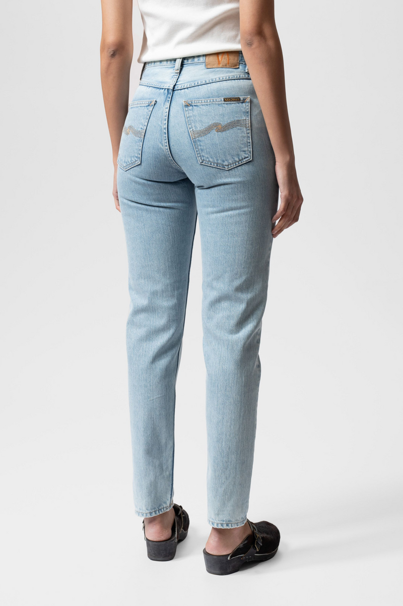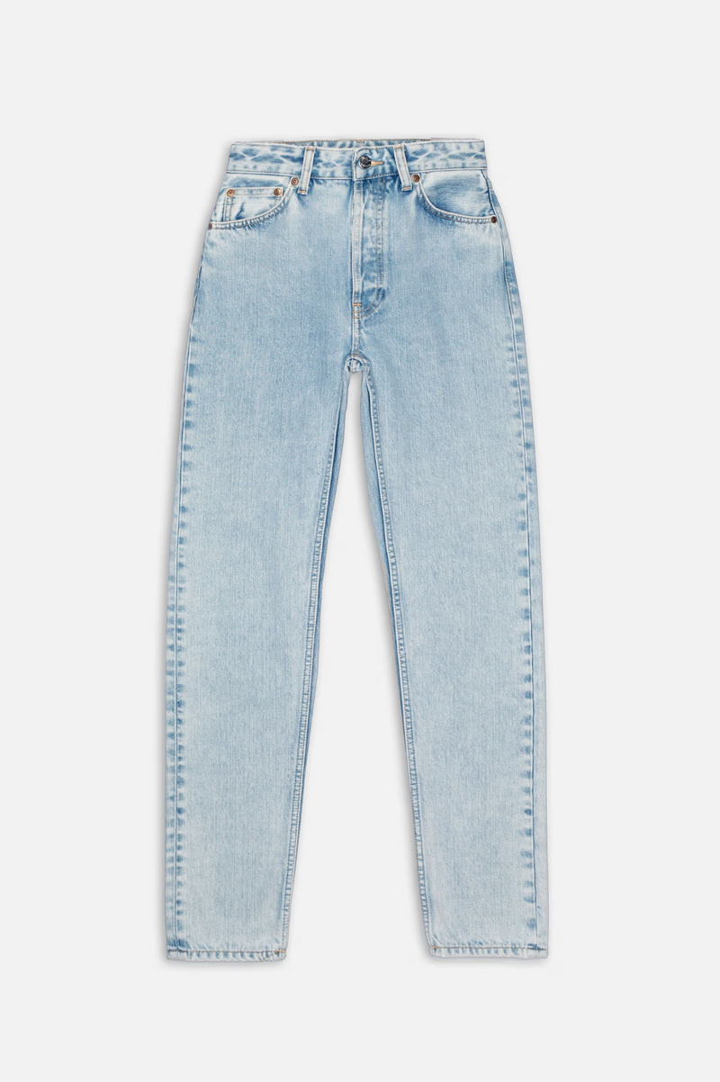 High-waist, regular-fit jeans with a tapered leg in a vibrant bright blue stonewash. Crafted from streaky denim, these jeans feature a remarkable texture highlighted by pronounced vertical slubs of varying length and thickness. The slubbiness is balanced by a subtle crosshatch pattern, adding depth and dimension to the fabric's flat, yet intriguingly rich, appearance.