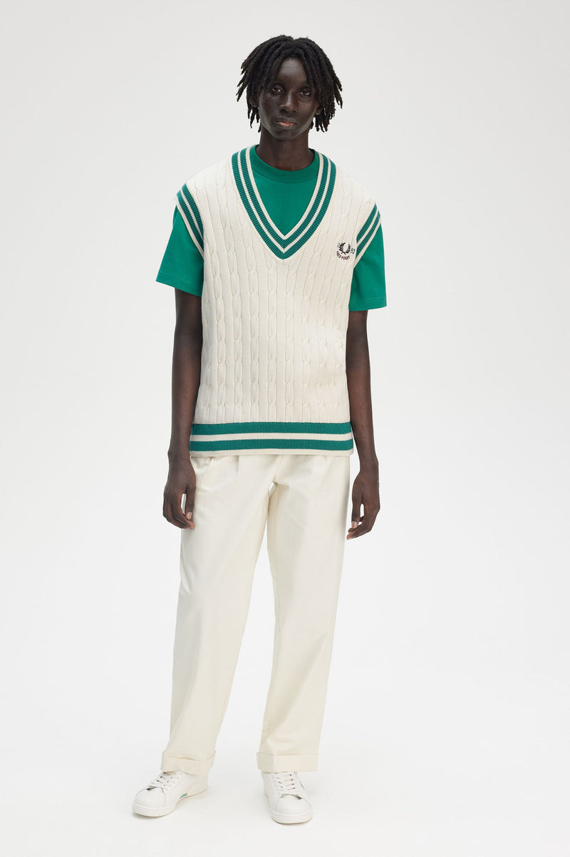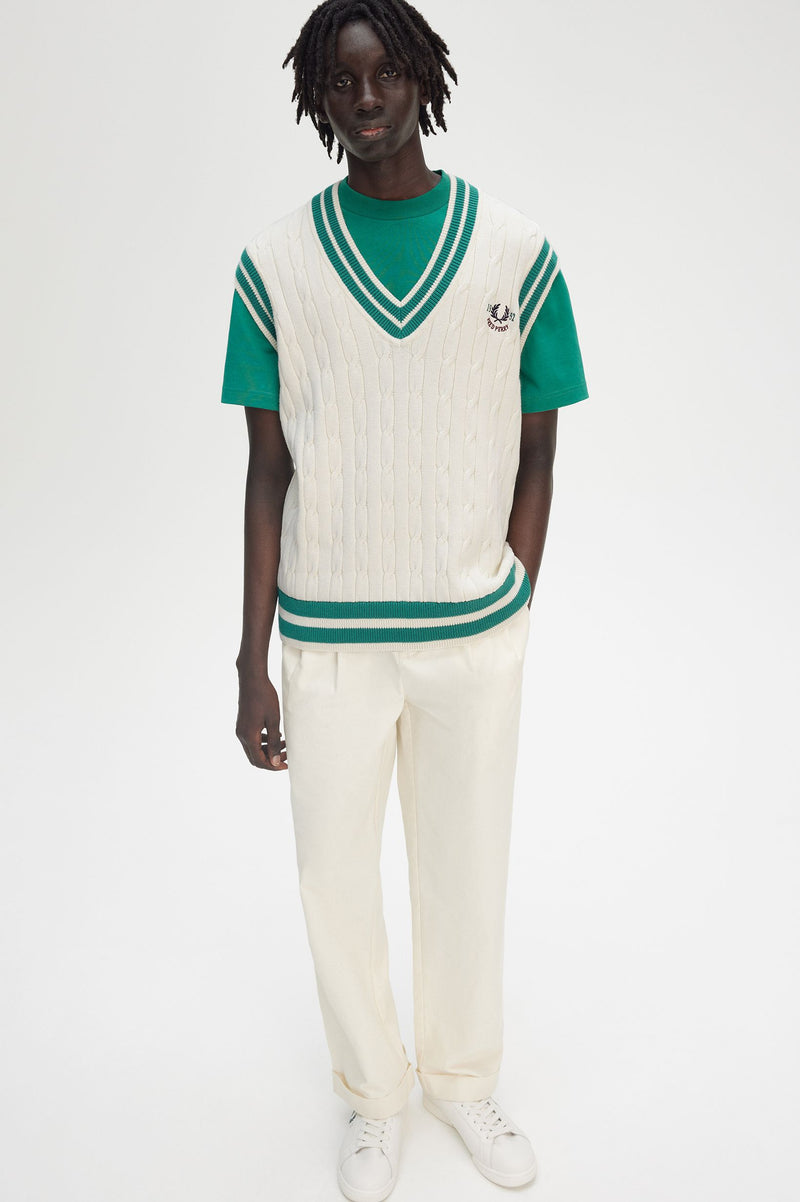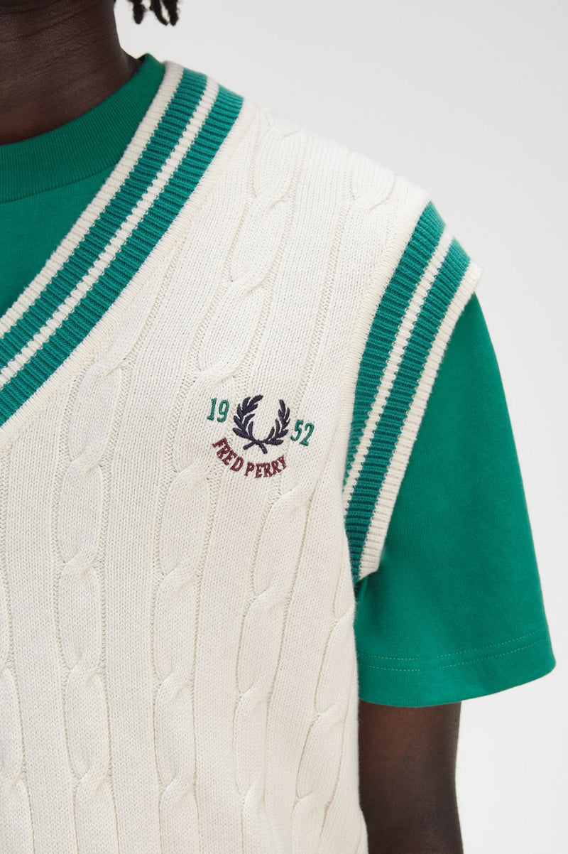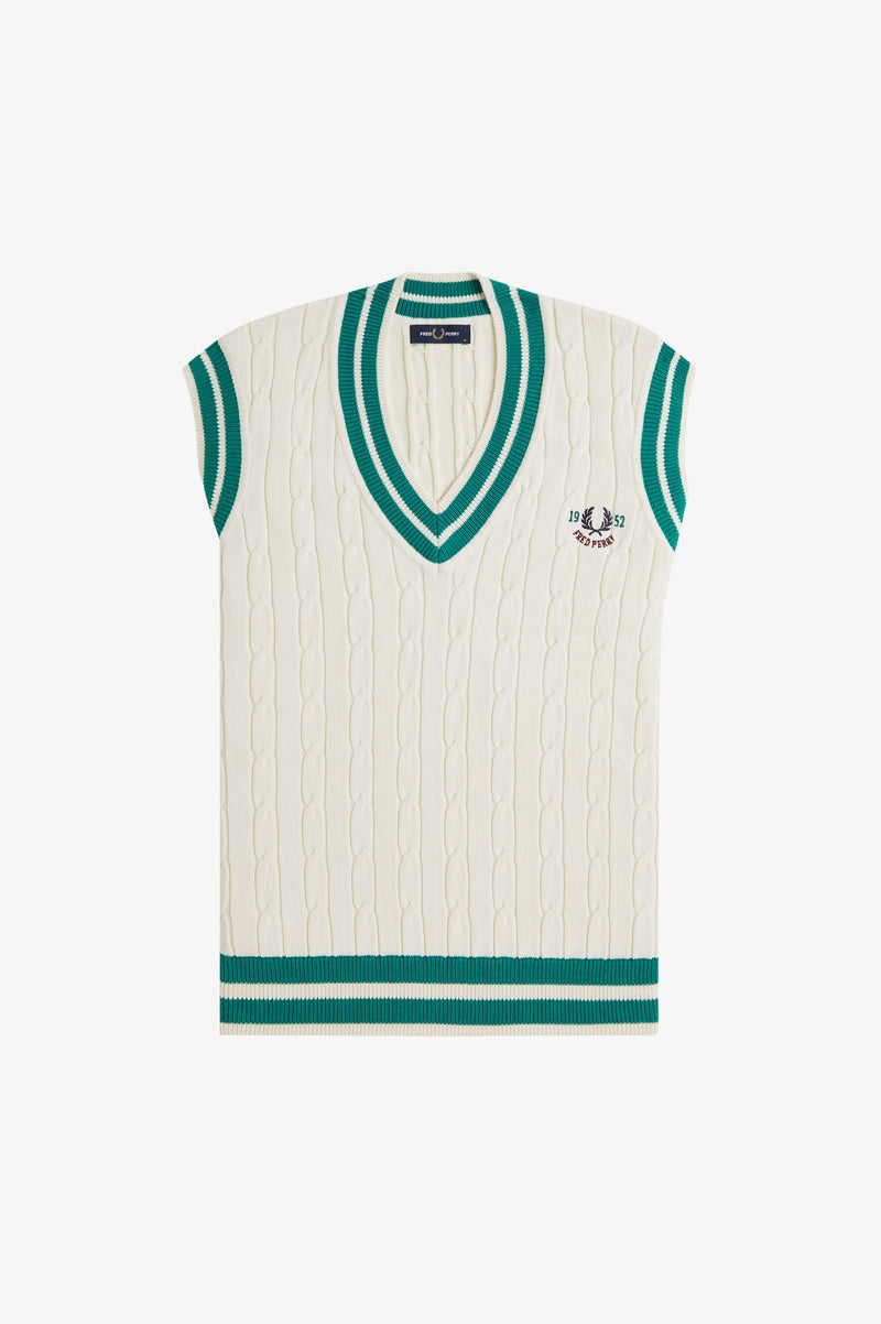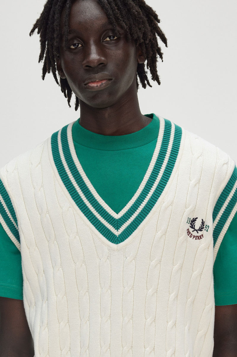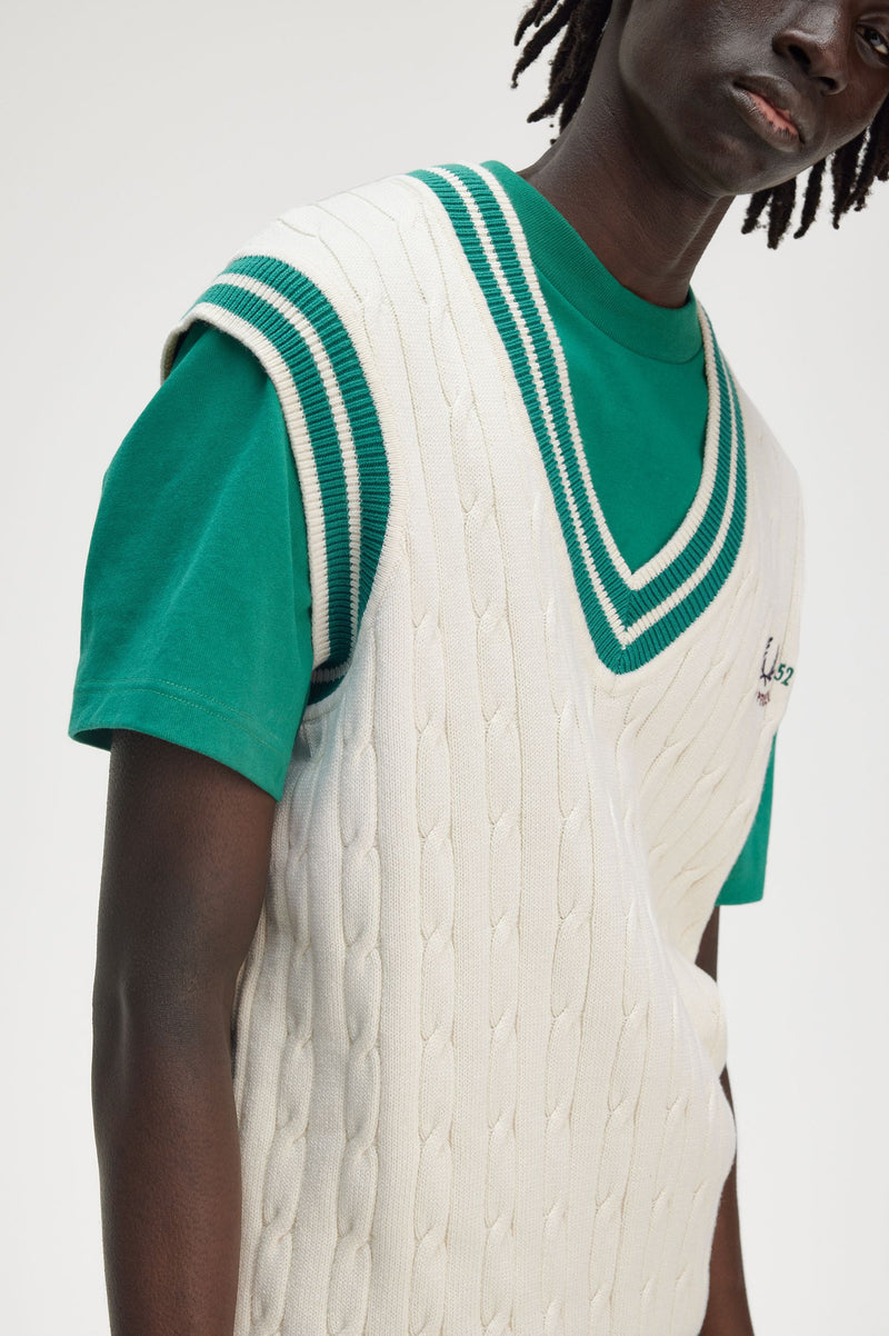 A tennis tank in a luxurious combed cotton cable knit, plaited with a small dose of recycled nylon for added flex and durability. More cultural cache than your regular cable knit, the chunky texture plays into the contemporary styles reimagining tennis-inspired streetwear. Trimmed with bold stripe tipping details and a deep V-neck, the Ecru and Label Green colour combination has been taken straight from our archive. Signed off with archive-inspired 1952 embroidery around our signature Laurel Wreath. Play on.
