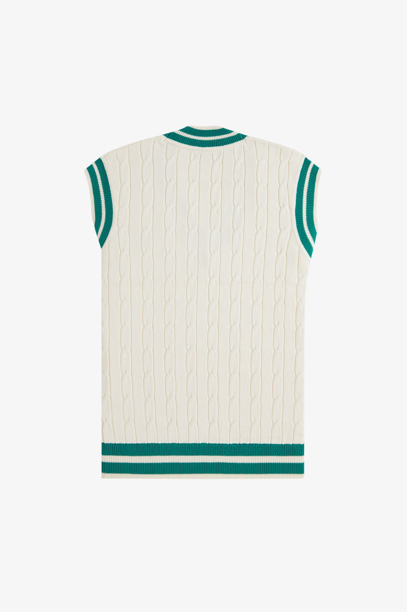 A cable knit tennis tank straight out of the archives, finished with the bold stripe tipping that’s synonymous with traditional sportswear. A timeless piece.