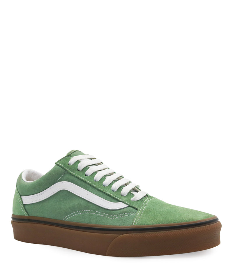 The Gum Old Skool, the Vans classic skate shoe and first to bear the iconic sidestripe, is a low top lace-up featuring sturdy canvas and suede uppers and gum-colored sidewalls. It also includes re-enforced toe caps to withstand repeated wear, padded collars for support and flexibility, and signature rubber waffle outsoles.