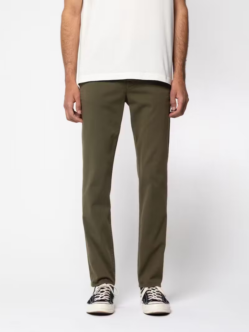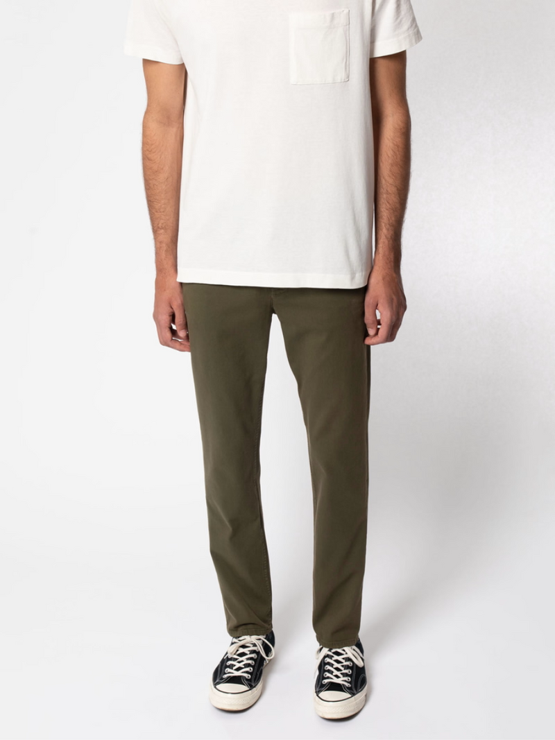 Slim fit four-pocket chino made in a clean organic comfort stretch twill. It is a contemporary classic with slanted front pockets, welt back pockets, chain stitch hems, and slim tapered fit. If you ask us, it is the perfect slim fit chino - fitted with a bit of room around the legs, making it look neat and fit very comfortably. Its sewn with heavy tone-in-tone thread with medium-short stitch length, which emphasizes its clean construction and pays homage to its workwear heritage.