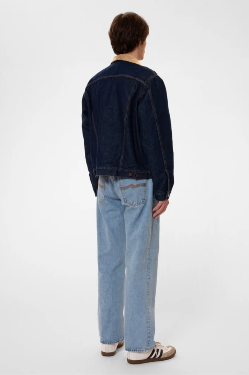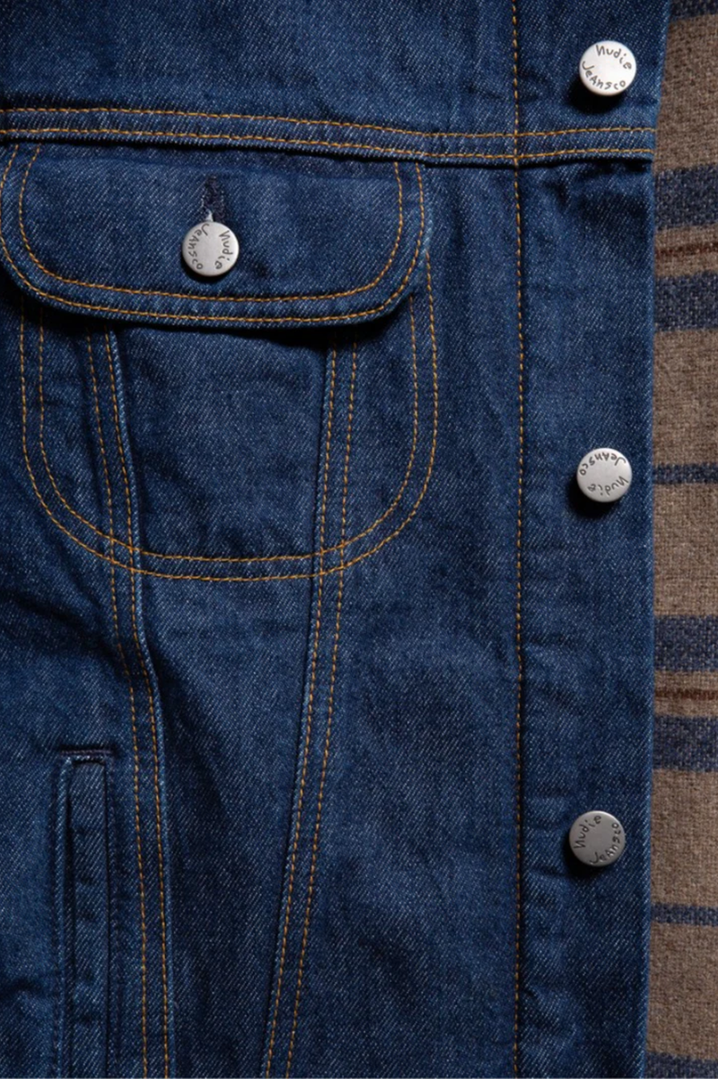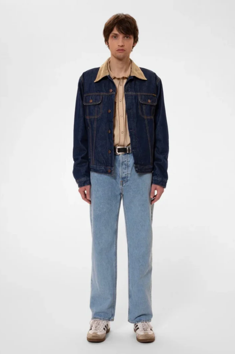 Lined regular-fit denim jacket equipped with two front welt pockets and two chest pockets. It is lined with a striped recycled wool blanket throughout the body and arms. The 14.9 oz. denim outer shell and the lining give the jacket a '90s workwear ruggedness - sturdy and tough. The fit allows for some layering, ensuring that you can stay warm as the temperature progresses downward. Another classic workwear feature is the corduroy-lined collar. If folded up the corduroy acts as a soft and warm lining around the neck. The brilliant mid-blue denim beautifully contrasts the collar, blanket lining, threads, and metal trims creating a timeless piece. And the best part is that the jacket will become more beautiful with time as the denim ages uniquely with you.