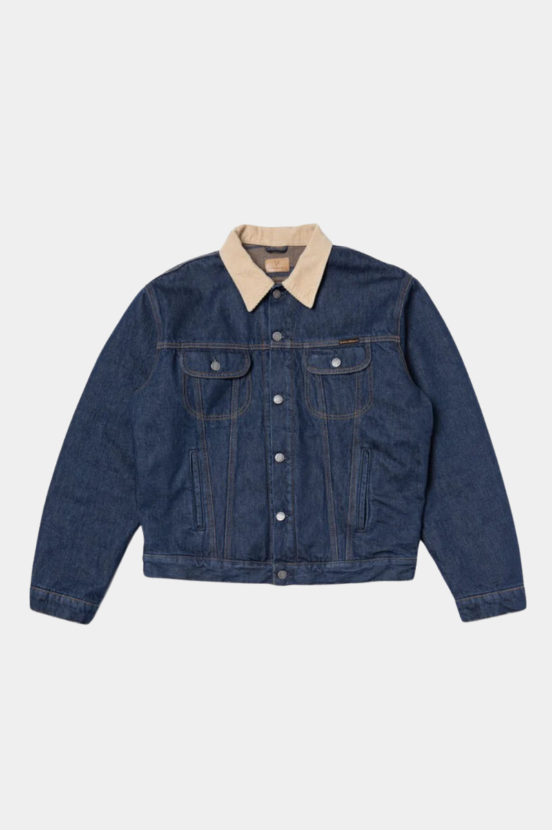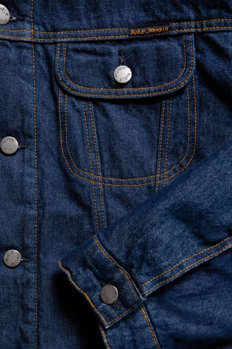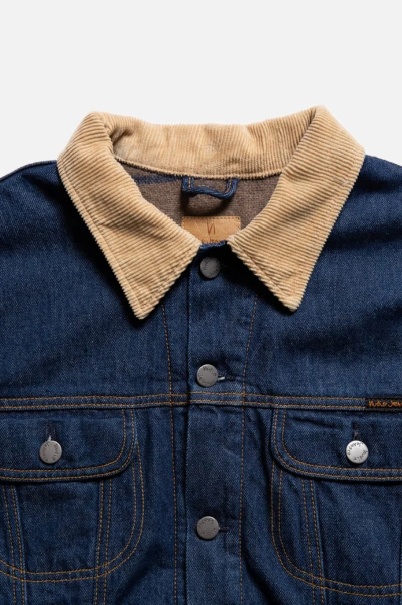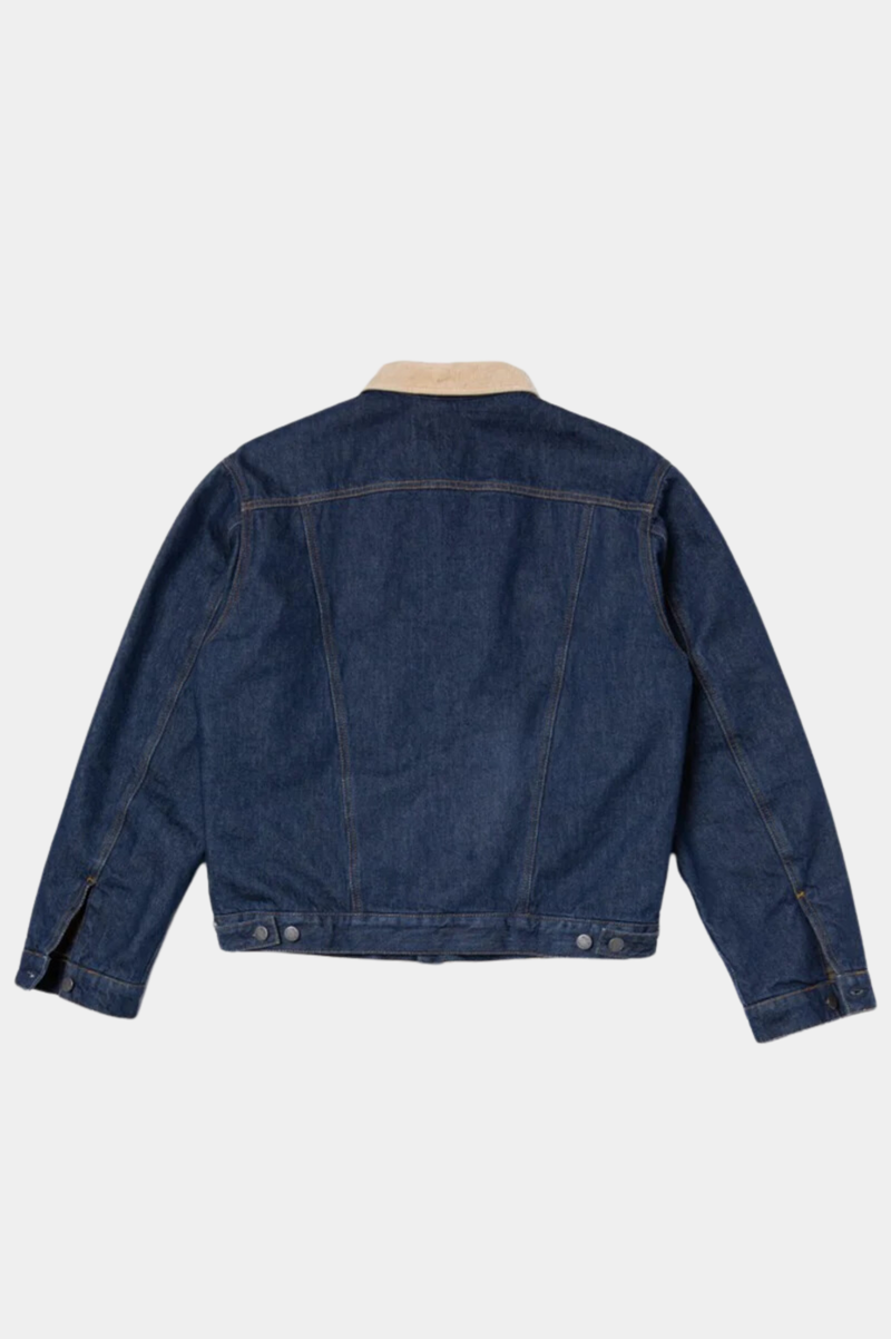 Lined regular-fit denim jacket equipped with two front welt pockets and two chest pockets. It is lined with a striped recycled wool blanket throughout the body and arms. The 14.9 oz. denim outer shell and the lining give the jacket a '90s workwear ruggedness - sturdy and tough. The fit allows for some layering, ensuring that you can stay warm as the temperature progresses downward. Another classic workwear feature is the corduroy-lined collar. If folded up the corduroy acts as a soft and warm lining around the neck. The brilliant mid-blue denim beautifully contrasts the collar, blanket lining, threads, and metal trims creating a timeless piece. And the best part is that the jacket will become more beautiful with time as the denim ages uniquely with you.