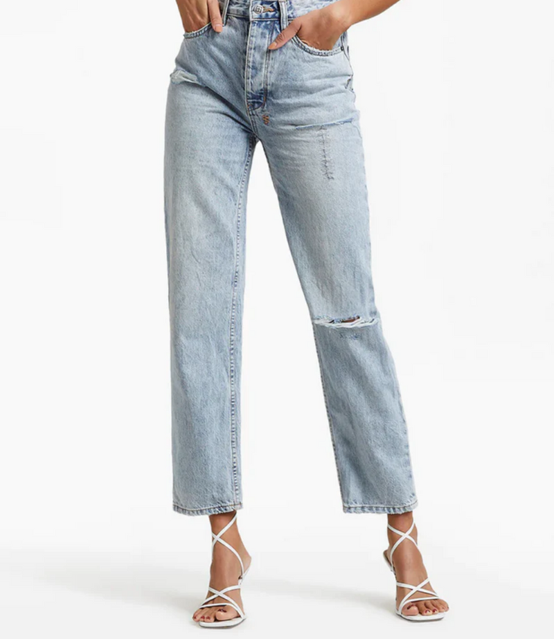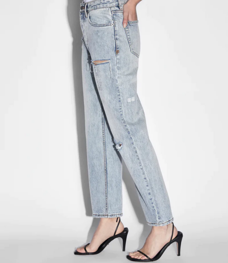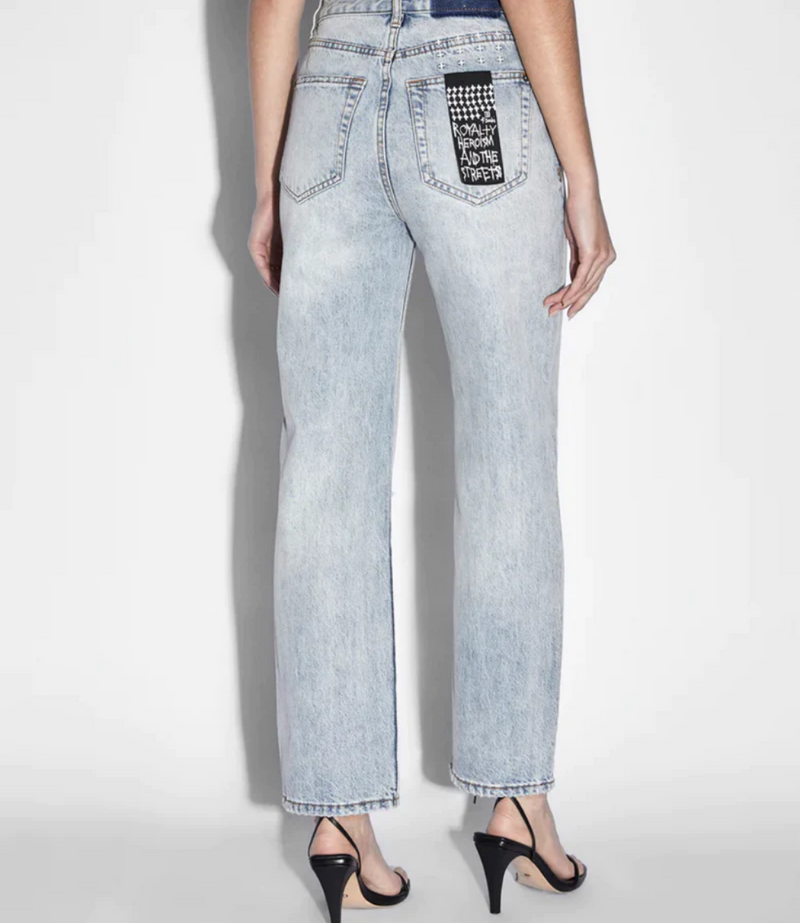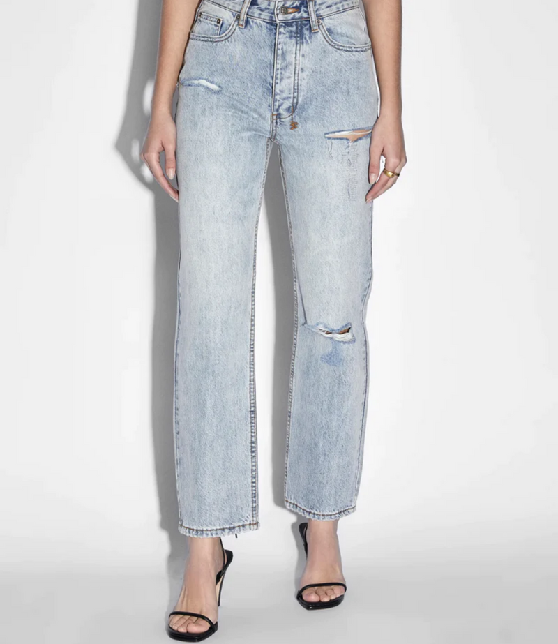 The Brooklyn Jean Skream Trashed is a mid rise, relaxed straight leg denim jean and classic five pocket styling. Made from premium rigid cotton denim featured in a light blue stone wash. This style features knee slash, decons, repair stitching detail and light distressing. Finished with signature Ksubi branding and removable pocket tag.