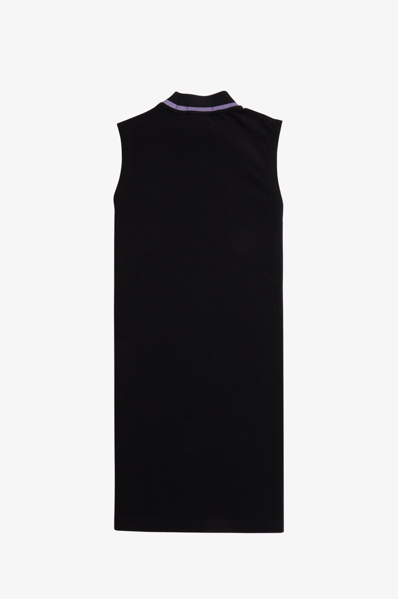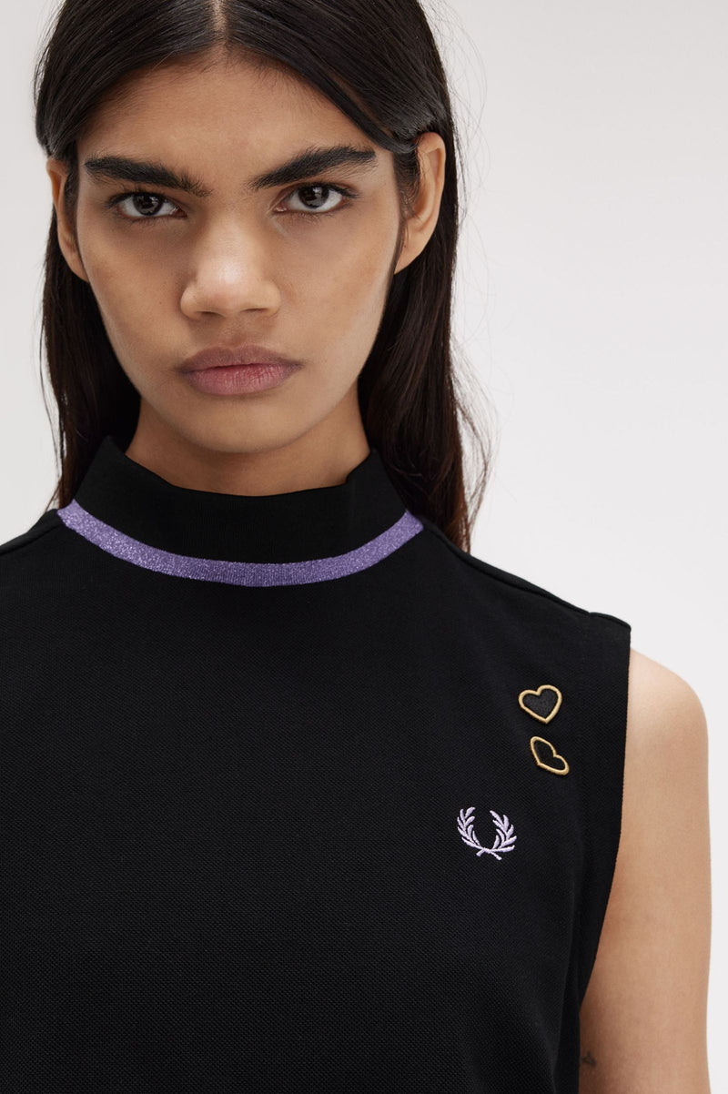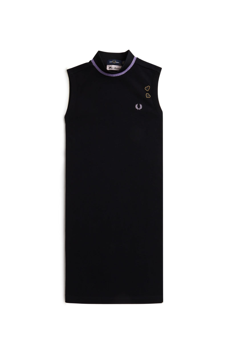 A knee-length, sleeveless style in our signature cotton piqué, with subtle nods to the sparkly glamour of Amy's on-stage wardrobe. Featuring a ribbed mock neck framed with our traditional single tipping - in slightly less traditional ultra-violet metallic yarn - and signed off with our Laurel Wreath and her love heart patches.