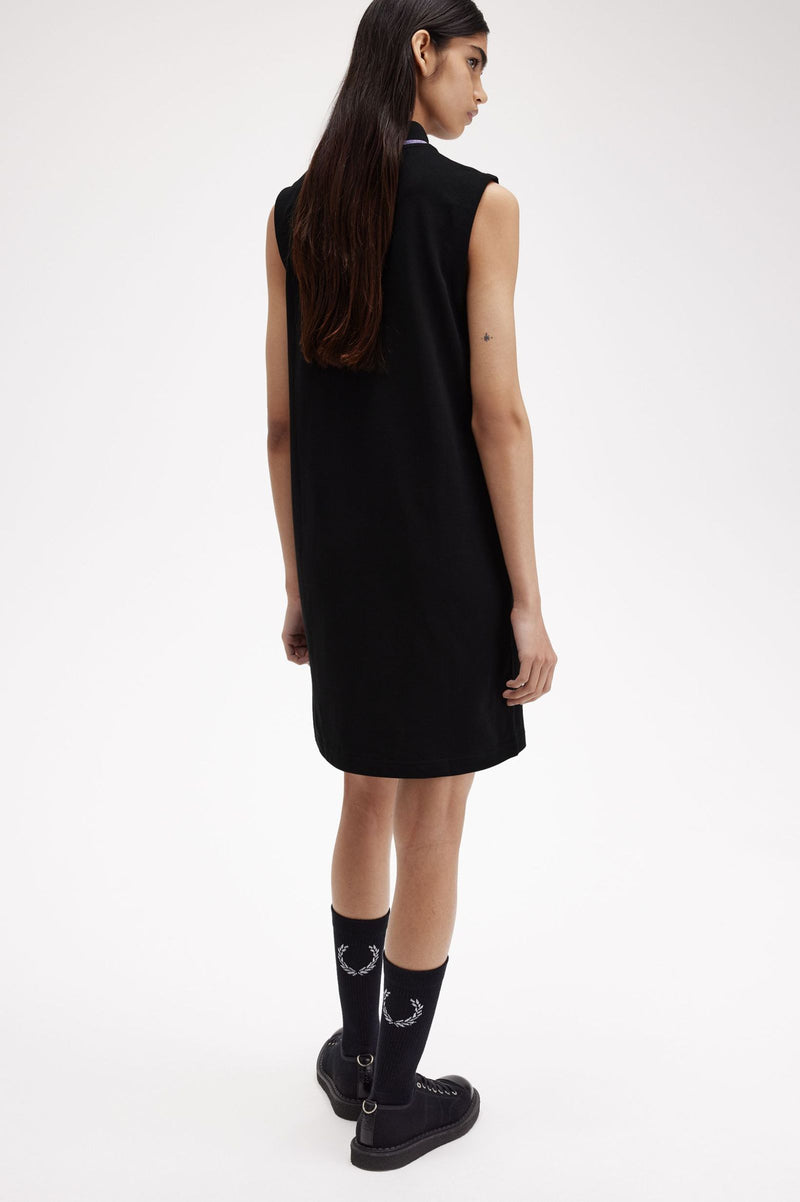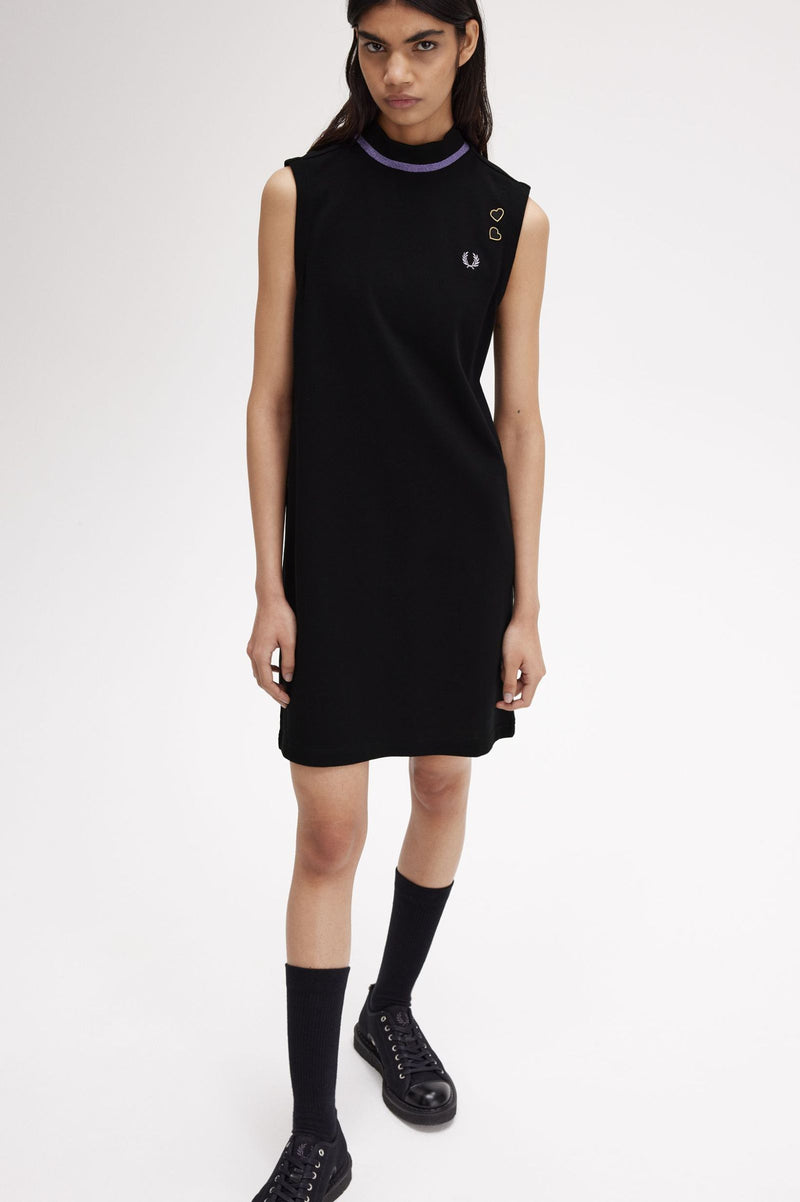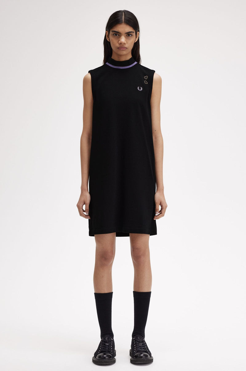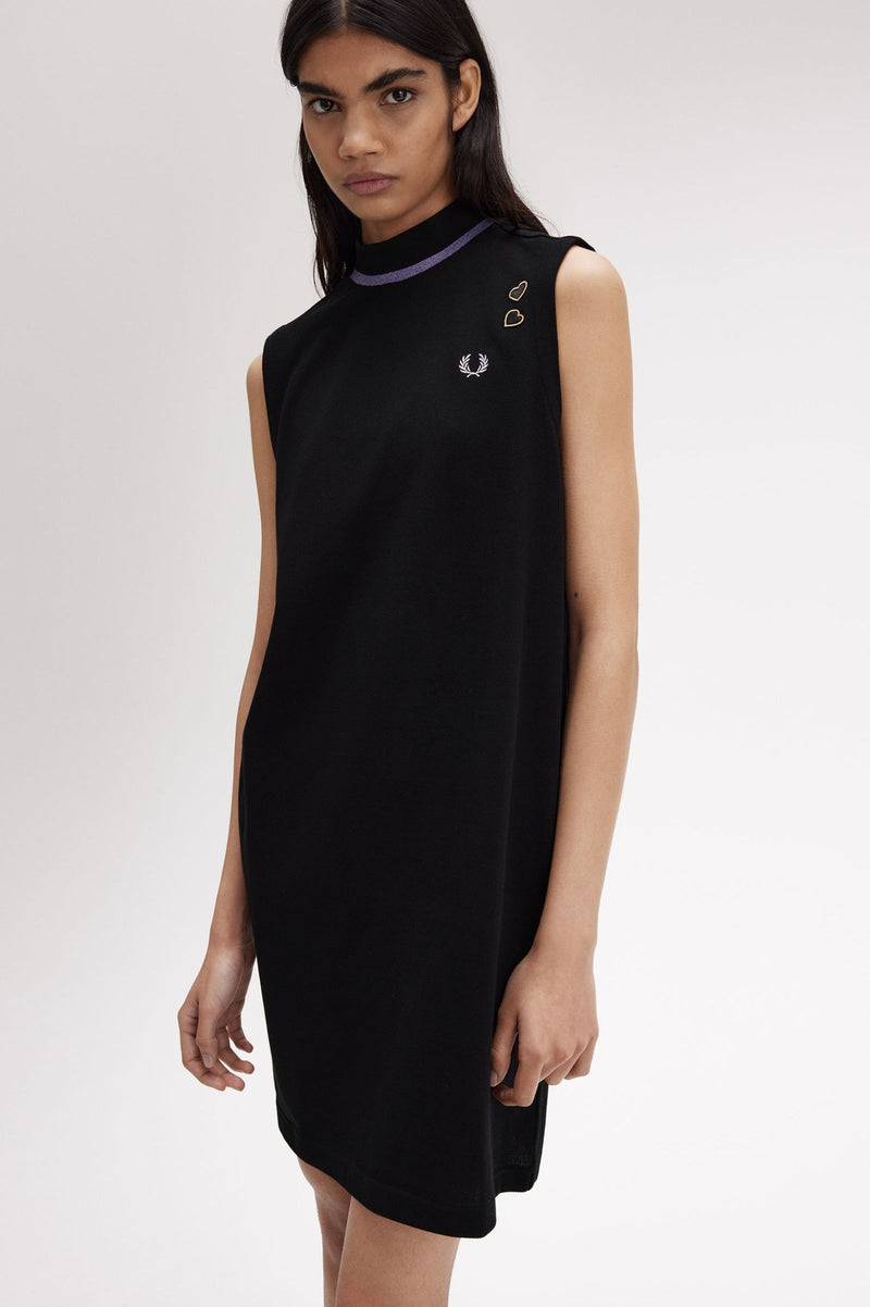 A knee-length, sleeveless style in our signature cotton piqué, with subtle nods to the sparkly glamour of Amy's on-stage wardrobe. Featuring a ribbed mock neck framed with our traditional single tipping - in slightly less traditional ultra-violet metallic yarn - and signed off with our Laurel Wreath and her love heart patches.