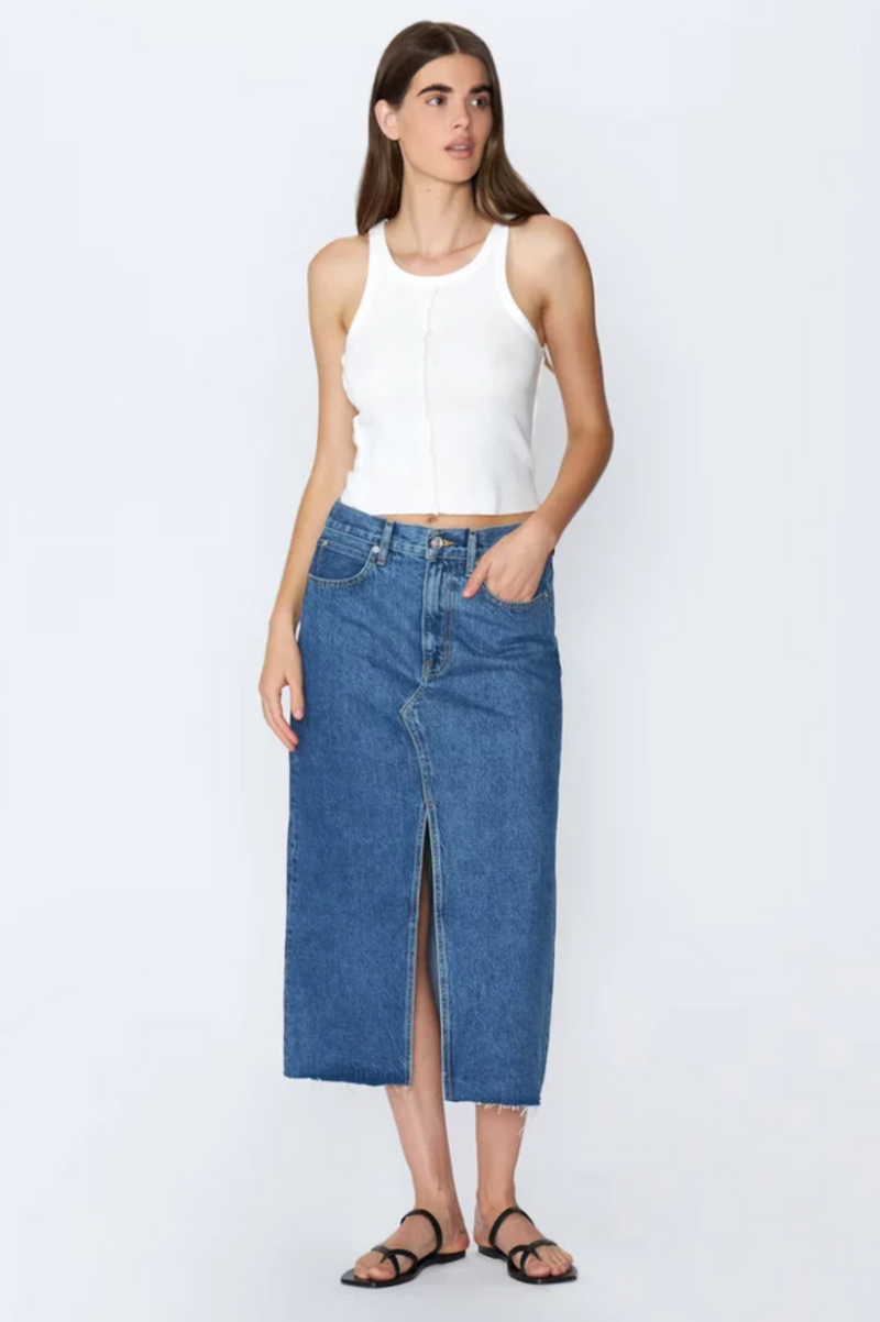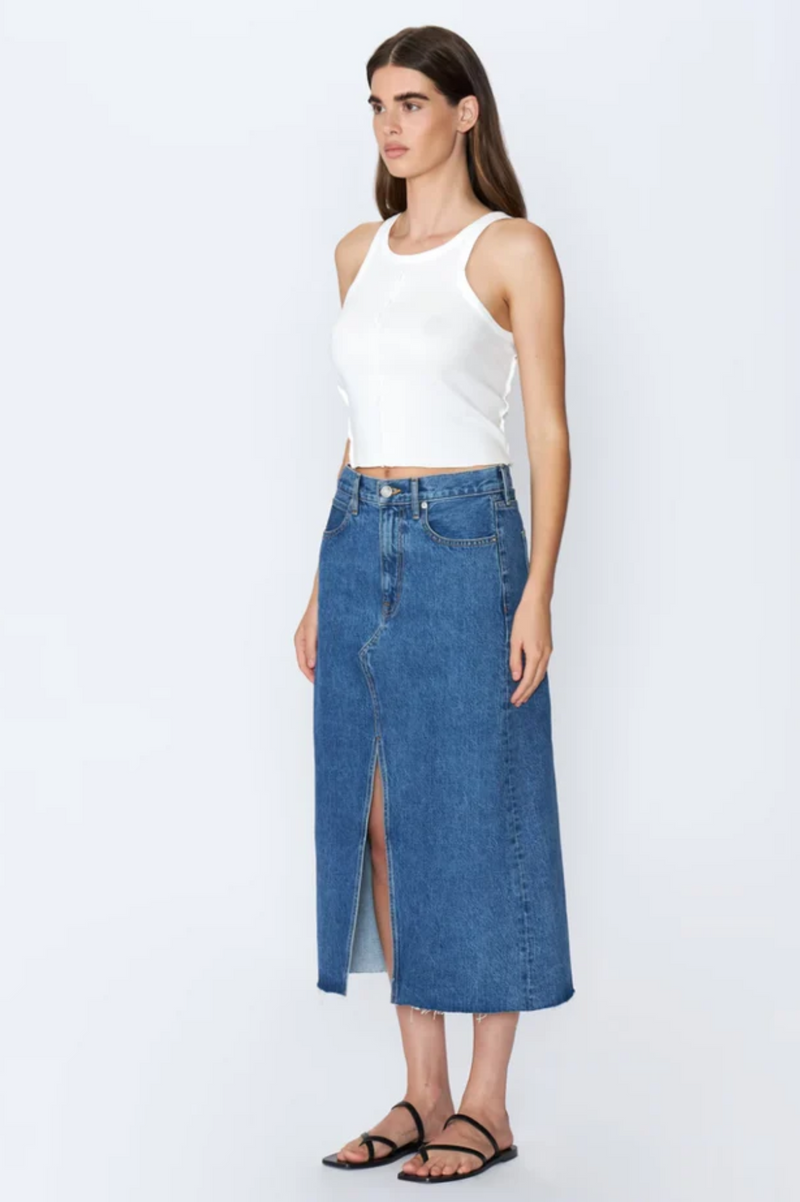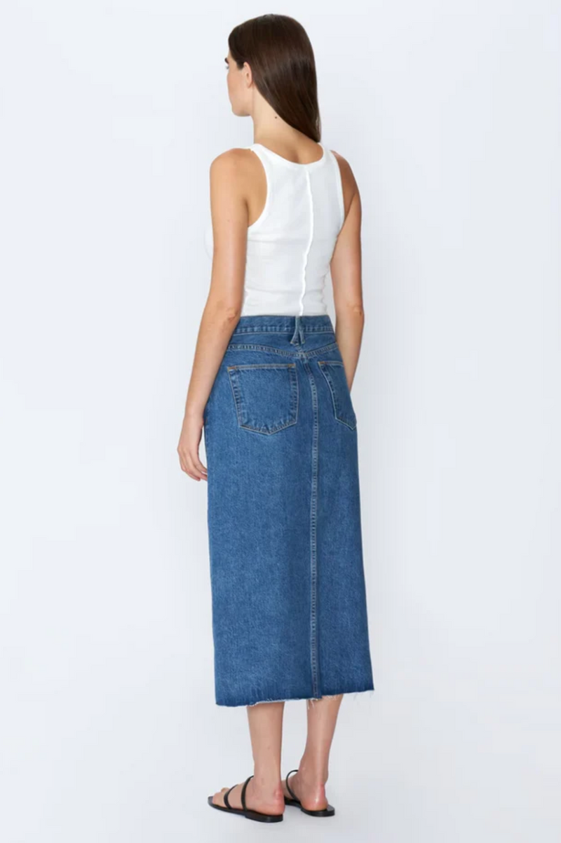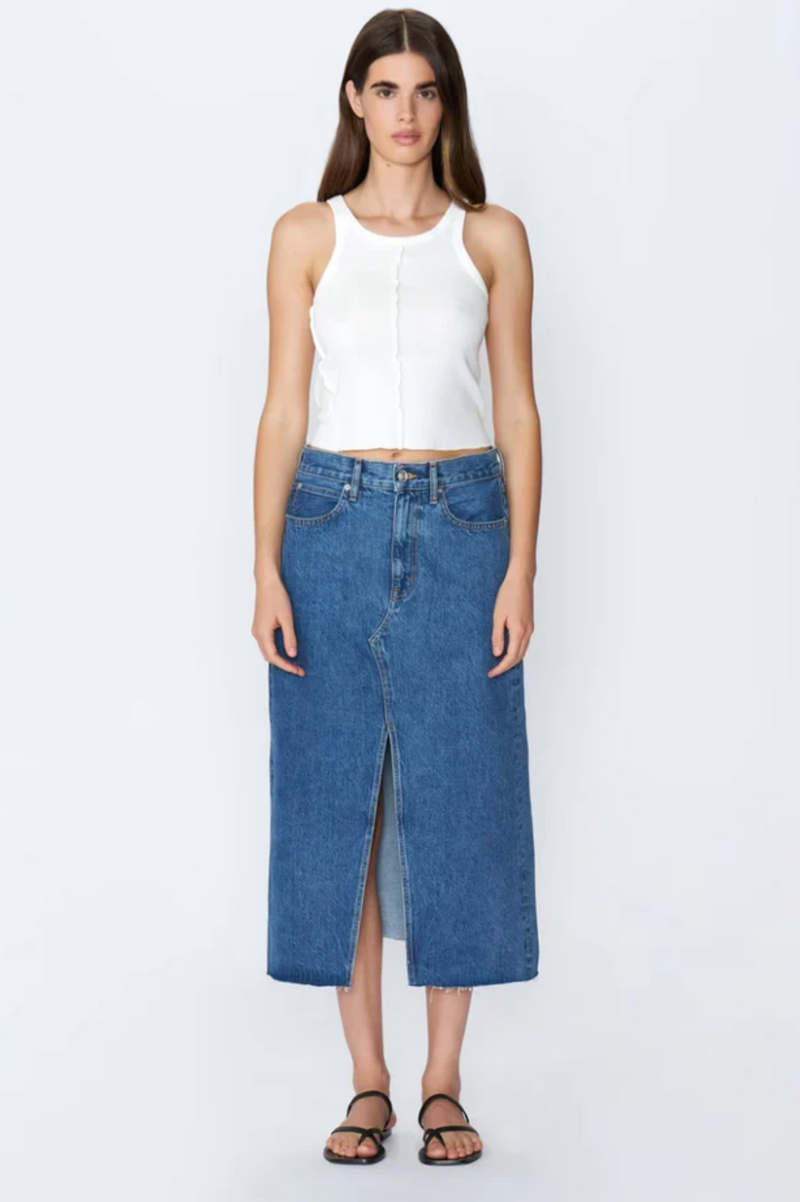 The Midi Skirt is designed with an A-line silhouette and features a front slit with raw hem. Can be worn true to size or sized up for a relaxed look. Quality and craftsmanship are at the heart of SLVRLAKE.