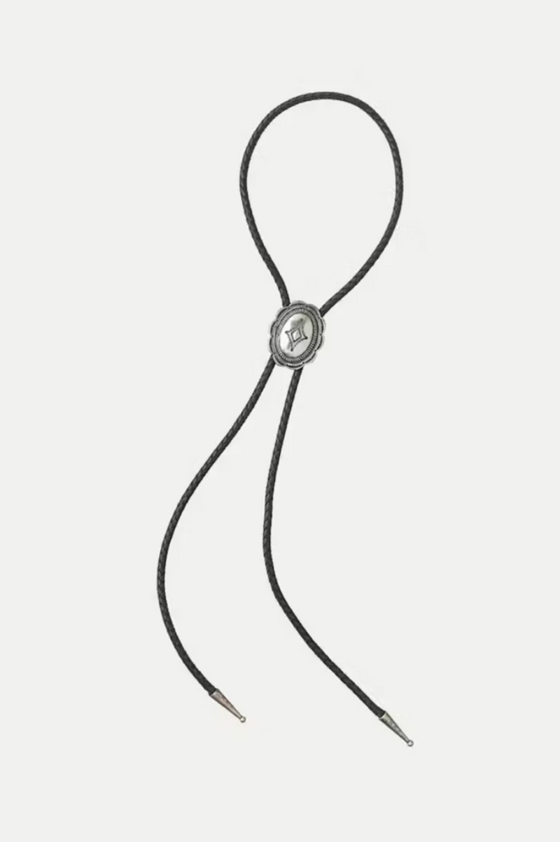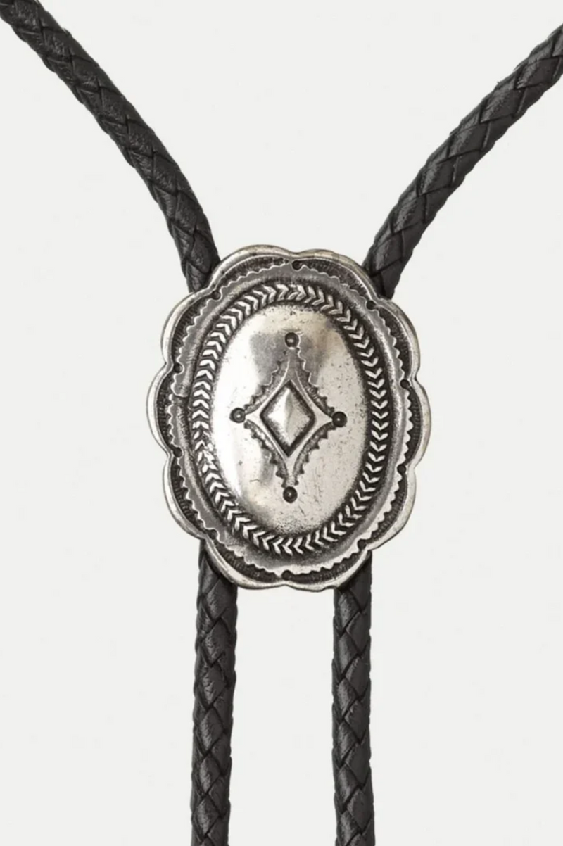 Bolo tie made from vegetable tanned leather strips that has been braided to a cord. The ornament clasp and the tips are engraved with a mismash of traditional and kurbits-like patterns.