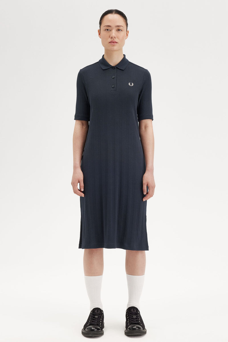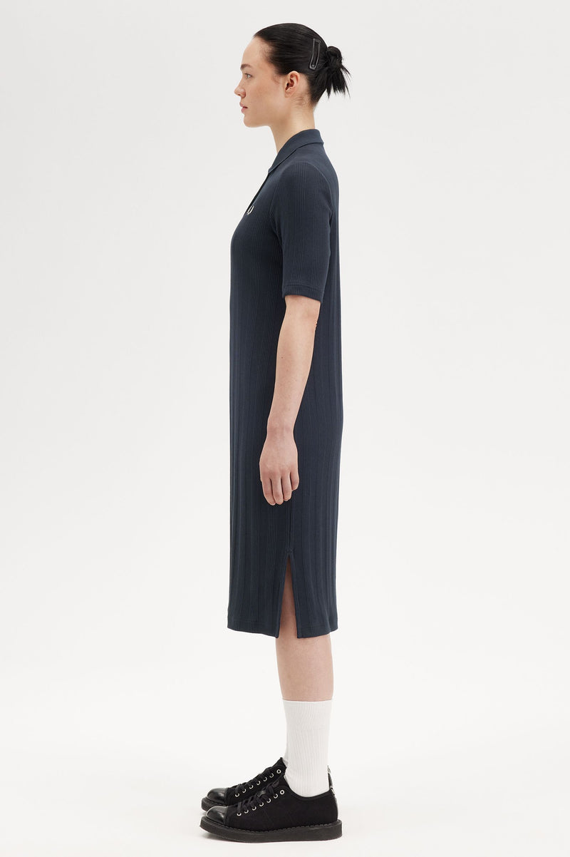 A polo shirt dress made from randomly woven ribbed fabric with a ribbed collar, long placket detailing and slits on both sides of the hem.