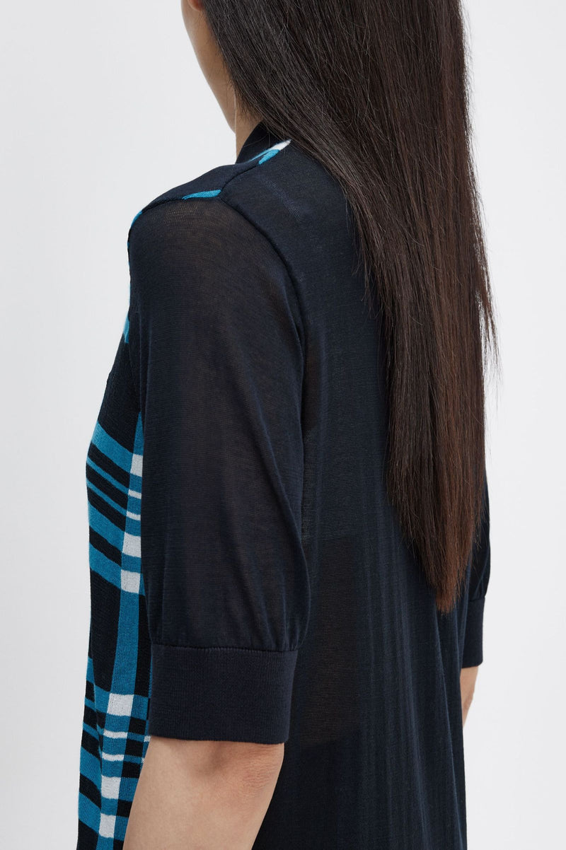A sheer cotton blend knitted shirt with a tartan design and contrasting trims.