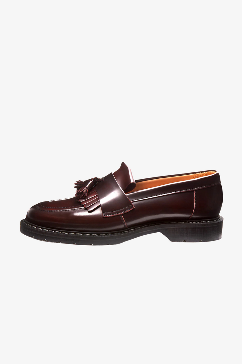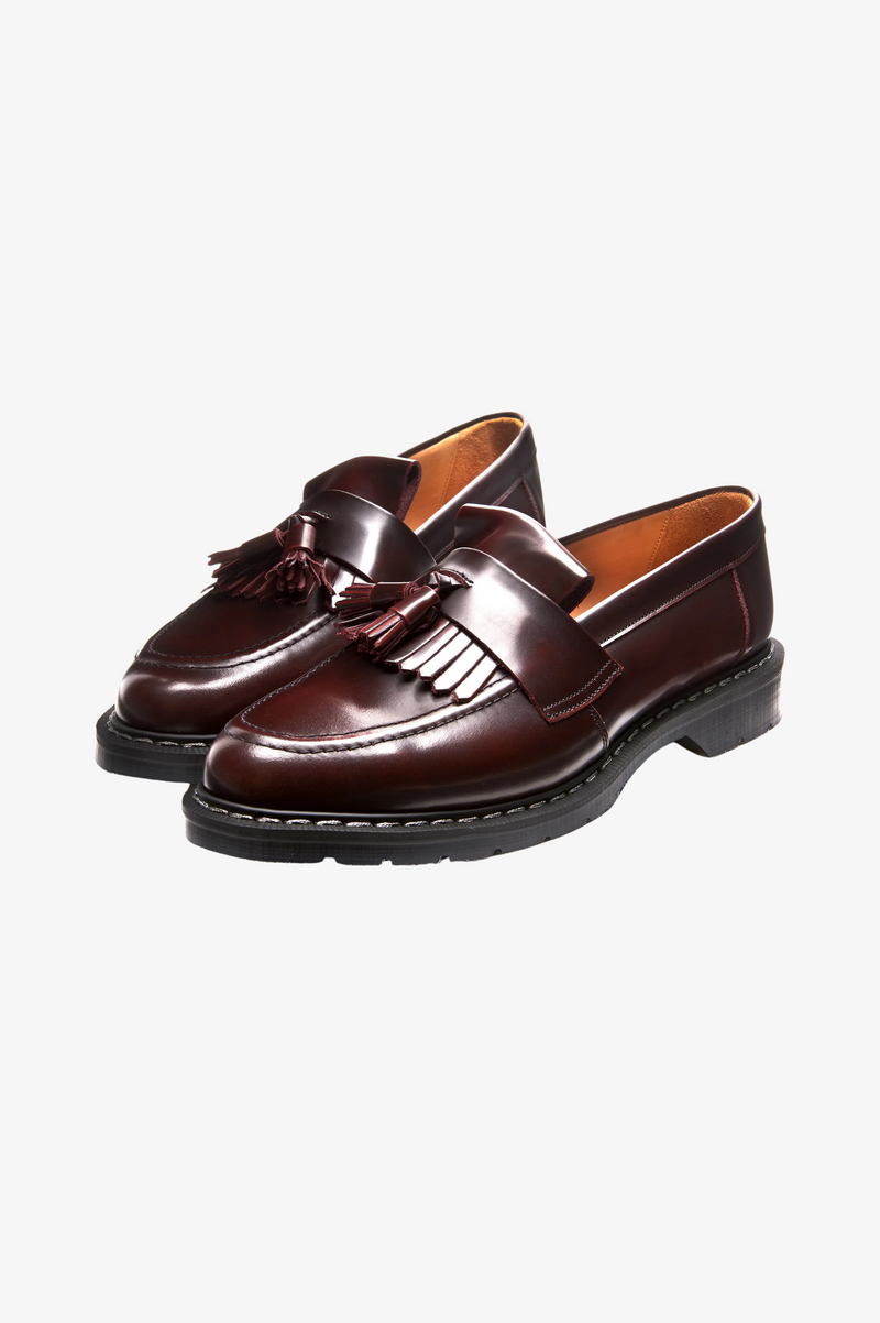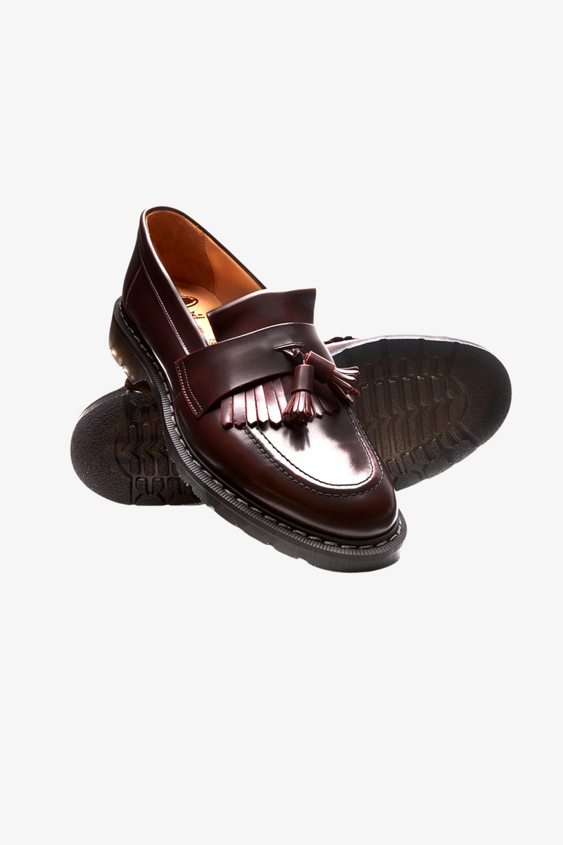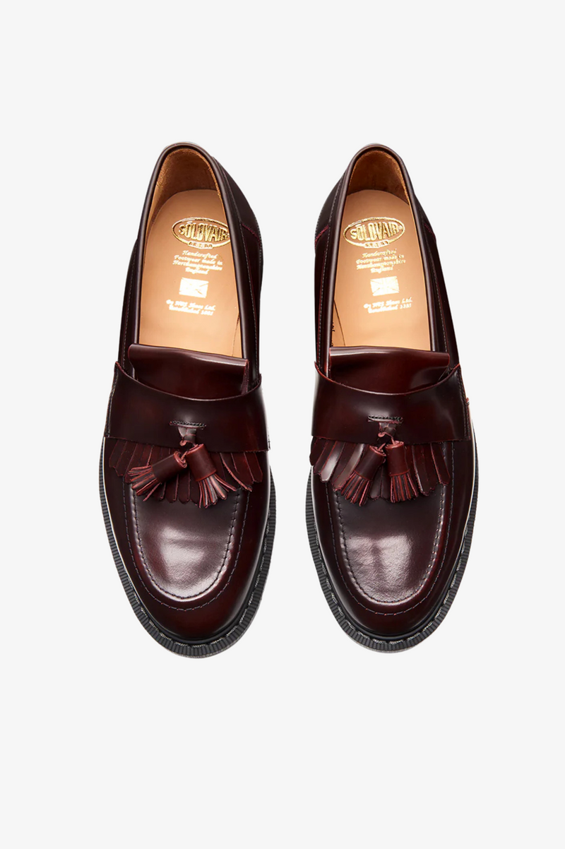 Solovair, founded in Northamptonshire, England in 1881, initially made boots for the British Army before shifting to fashionable, long-lasting footwear. Their unique Goodyear welt method ensures toughness involving stitching a welt and a pre-formed canvas strip onto the insole, showing the brand's commitment to quality craftsmanship. Featuring a leather upper and Soft Sole Suspension technology, the Hi-Shine Tassel Loafers offer both comfort and durability with its slip on style.