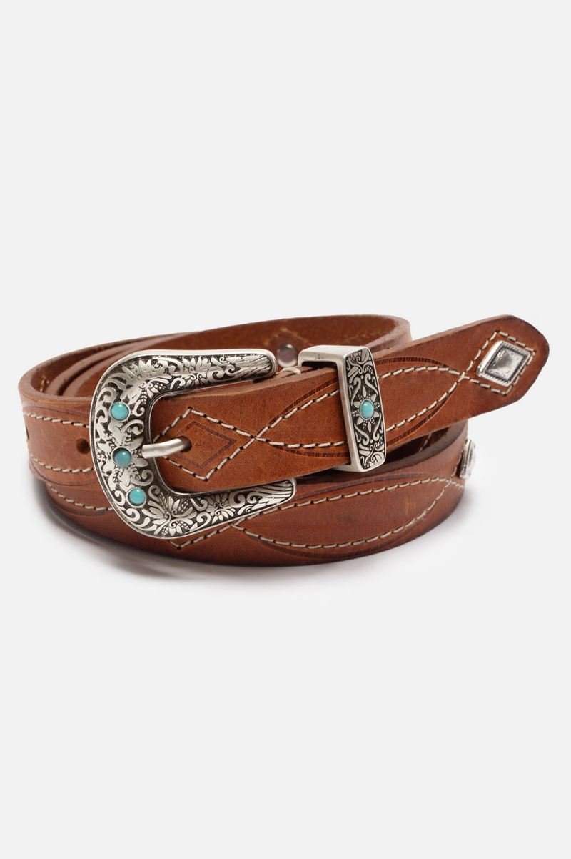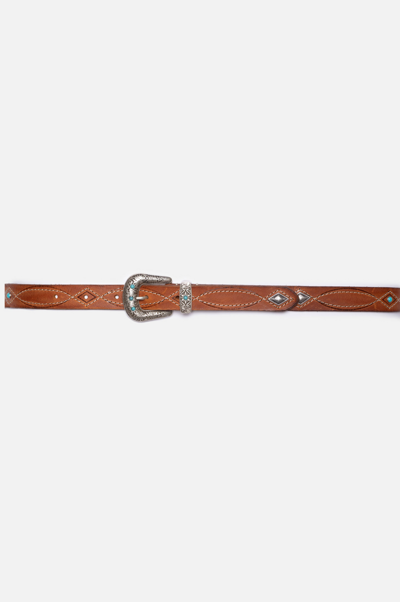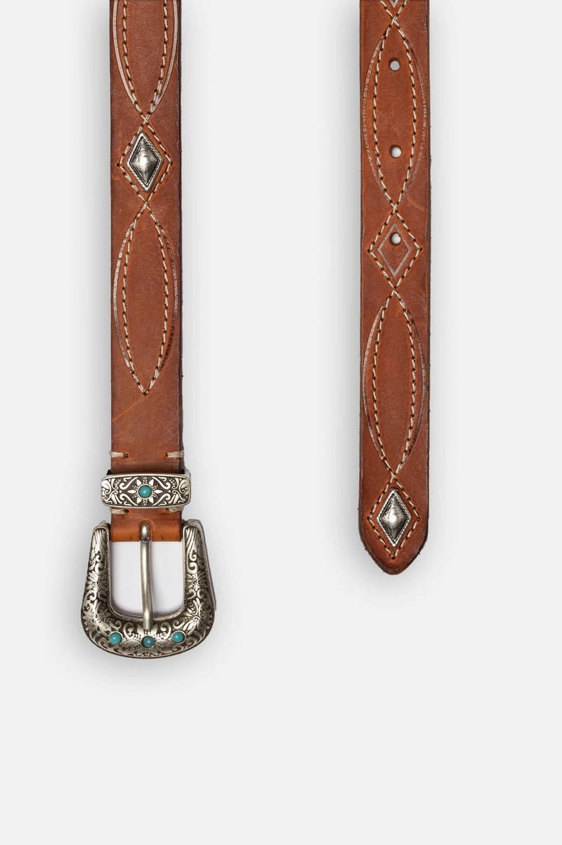Western-style belt adorned with ornamental metal buckle, loop, and tip. Crafted from vegetable-tanned full-grain leather, the belt showcases stitched patterns, diamond-shaped metal ornaments, and faux gemstones.