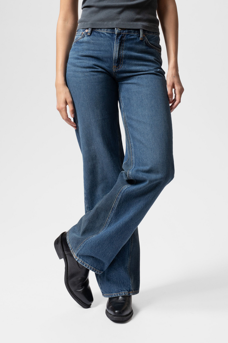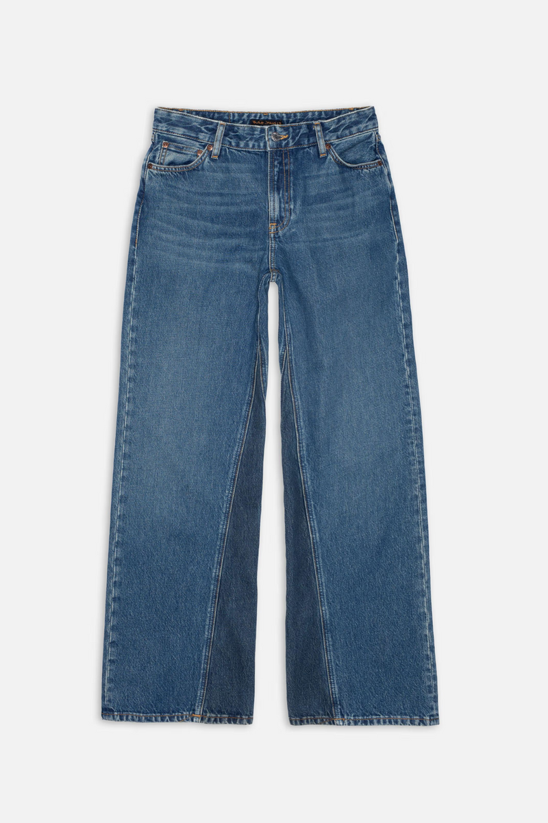 These loose, low-waist jeans feature a wide leg with contrasting gussets at the inseam, adding a playful twist. The denim has been washed to a muted mid-blue hue, while the gussets retain a darker shade. Soft highlights and subtle wear marks contribute to a soft authentic denim aesthetic. The slight grayish undertone enhances their understated, unique appeal, while the gussets provide an extra layer of visual interest.